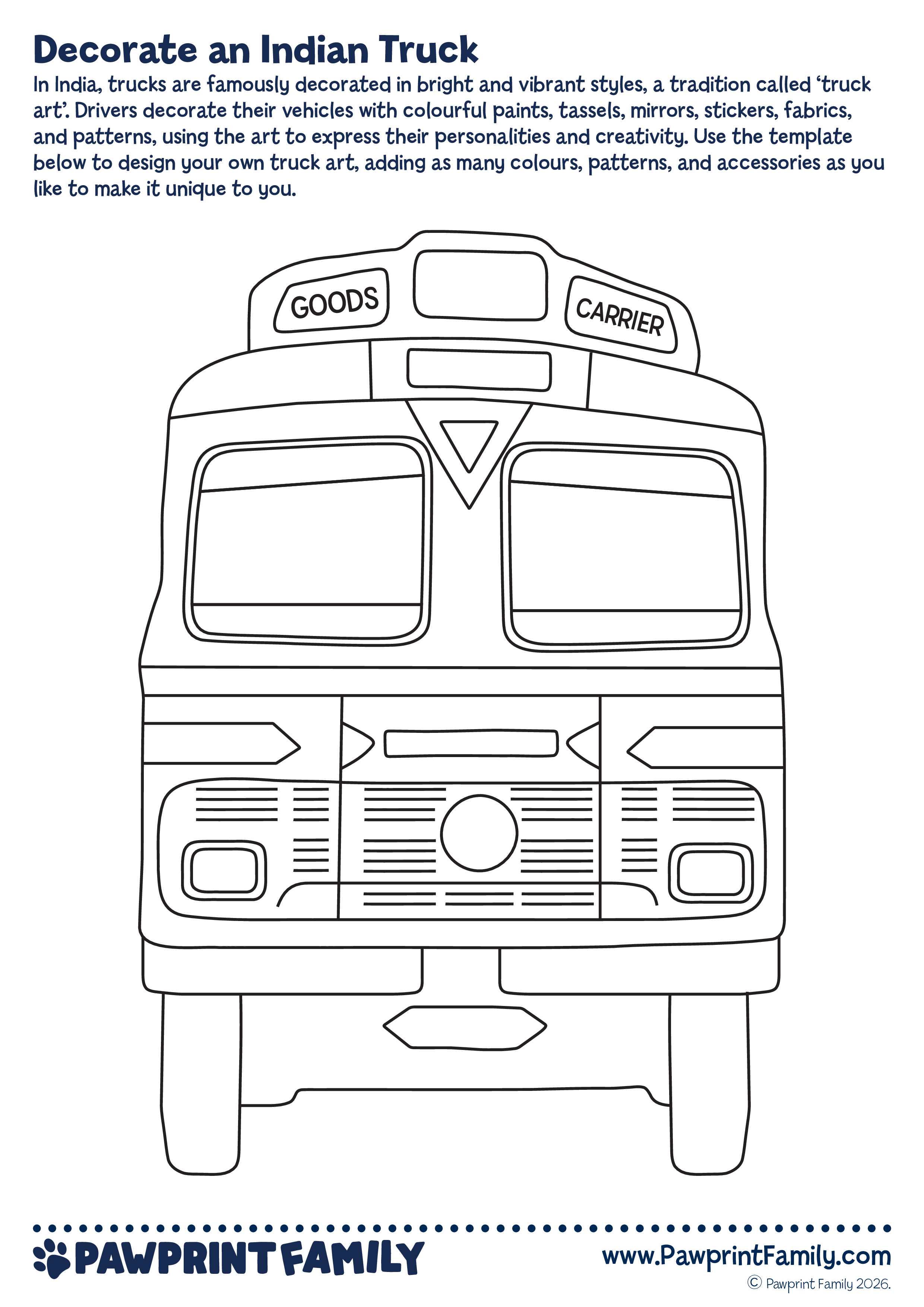 Download, print, and design! Decorate an Indian Truck is part of the Pawprint Family’s free resource collection – making global learning irresistible through creative activities inspired by cultures around the world.