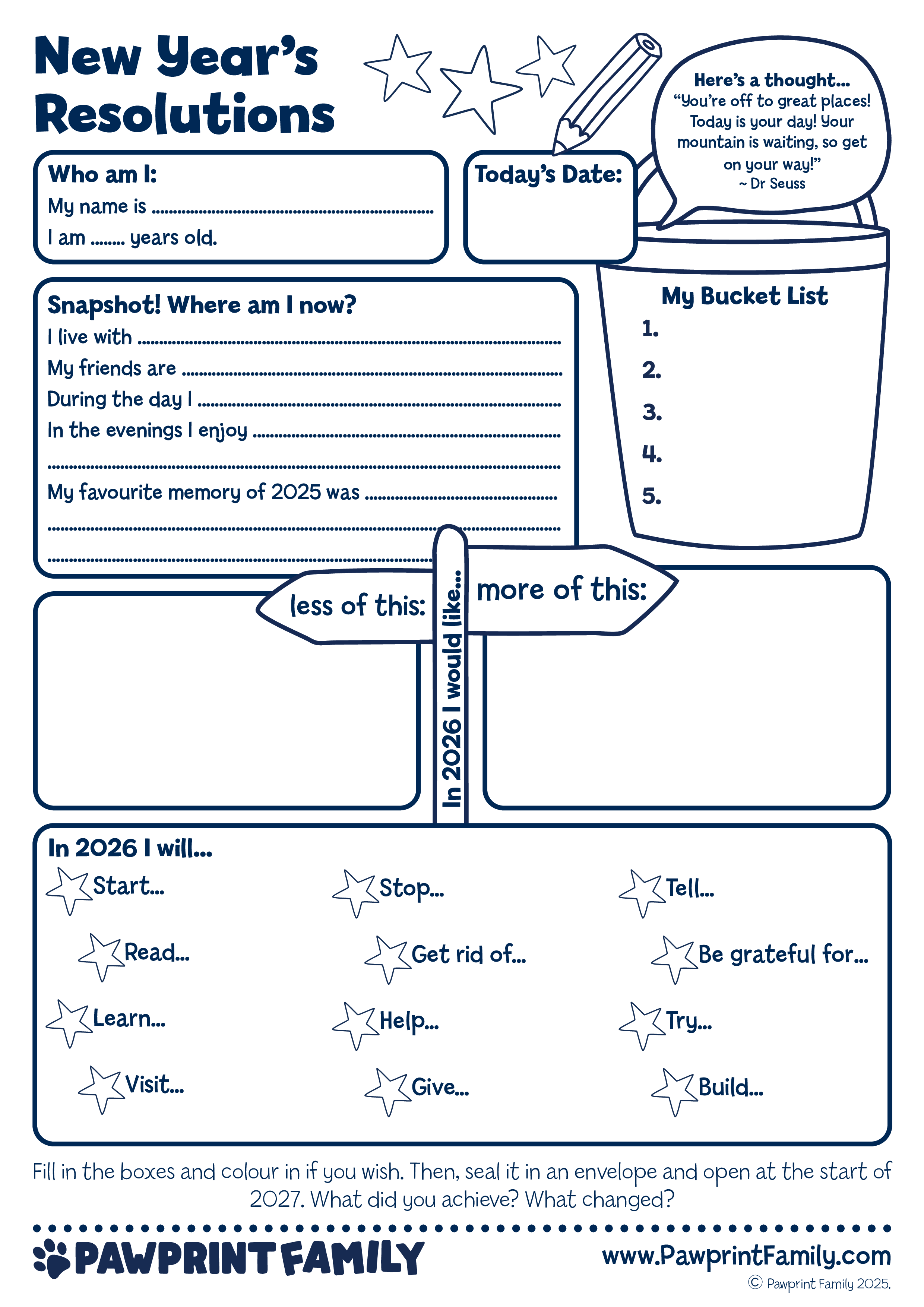 Download, print, and reflect! The New Year’s Resolutions 2025/2026 Activity Sheet is part of the Pawprint Family’s free resource collection – helping young adventurers step into a new year with confidence, clarity, and excitement for what’s ahead.
