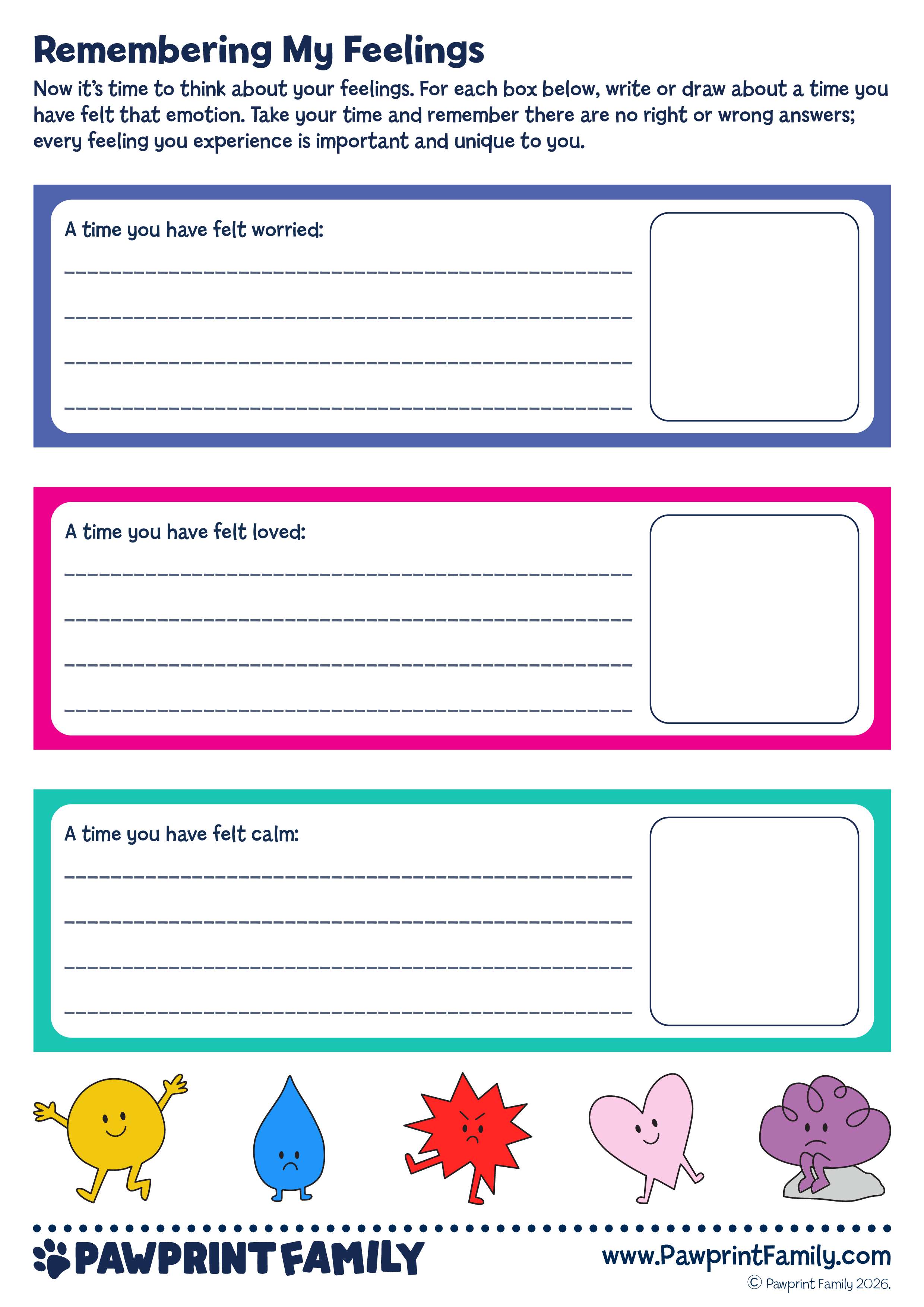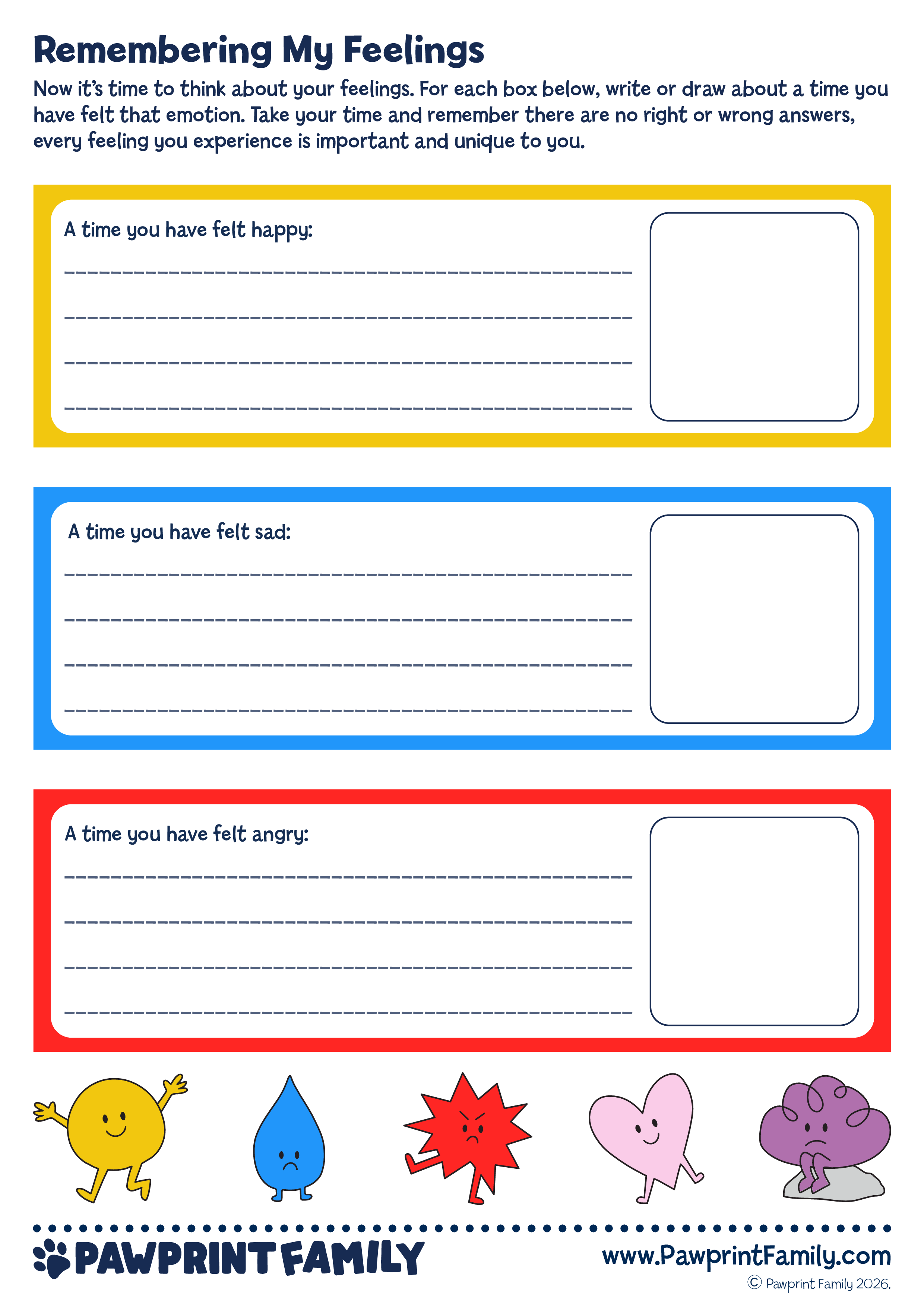Download, print, and reflect. Remembering My Feelings is part of the Pawprint Family’s free resource collection – supporting emotional growth and wellbeing through thoughtful, child-centred activities.