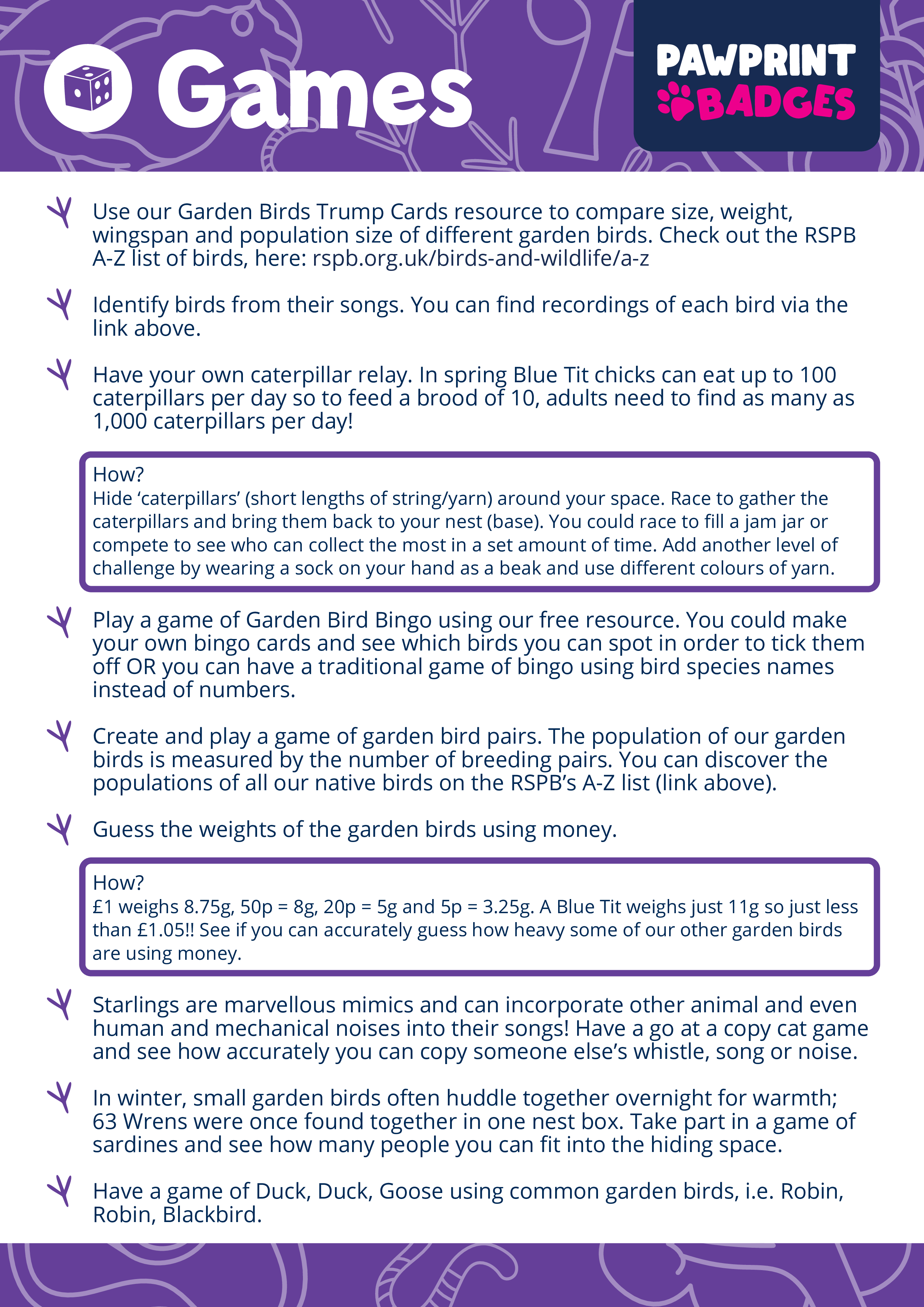 Play Garden Bird Bingo, Guess the Weight, or the Caterpillar Relay