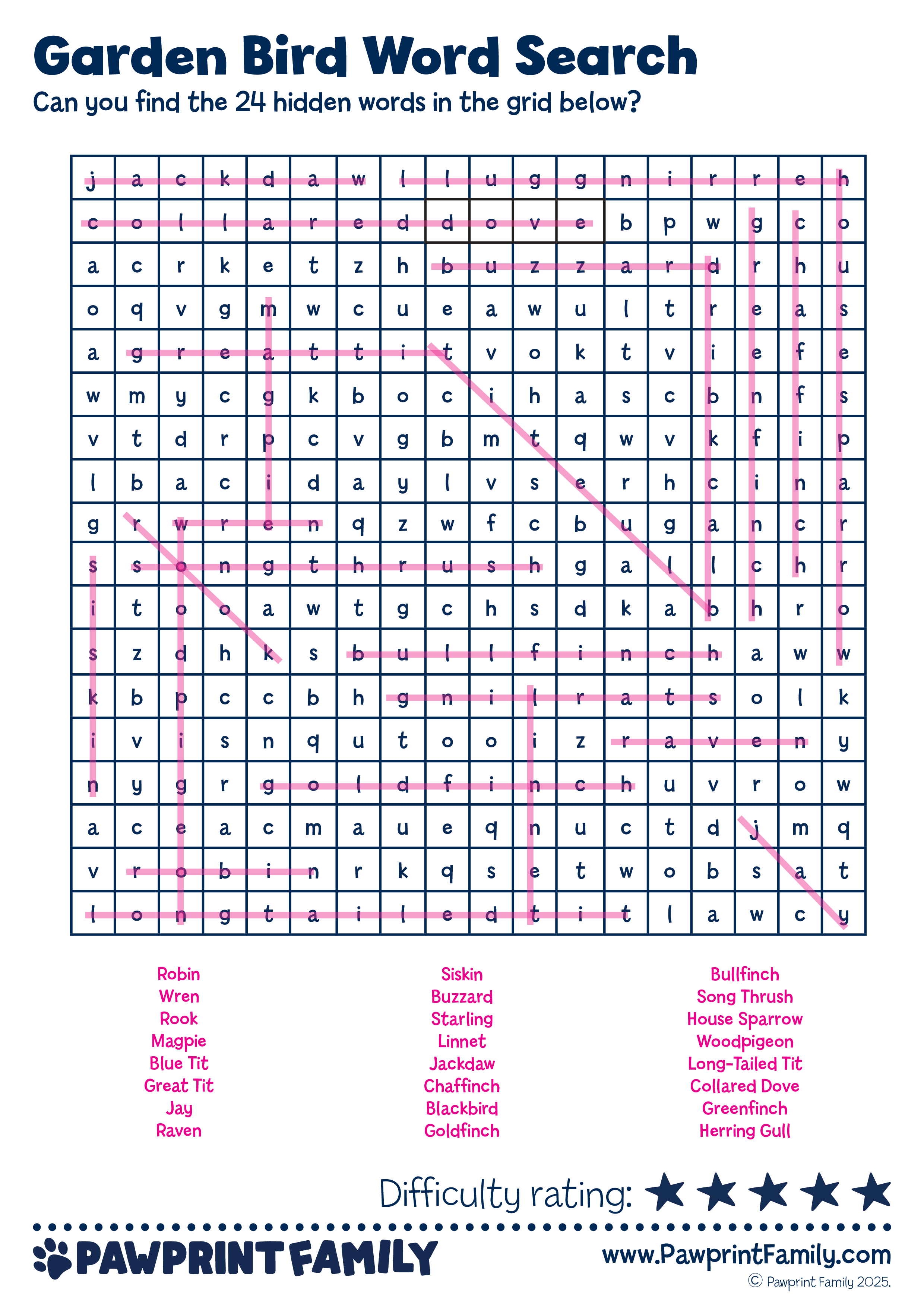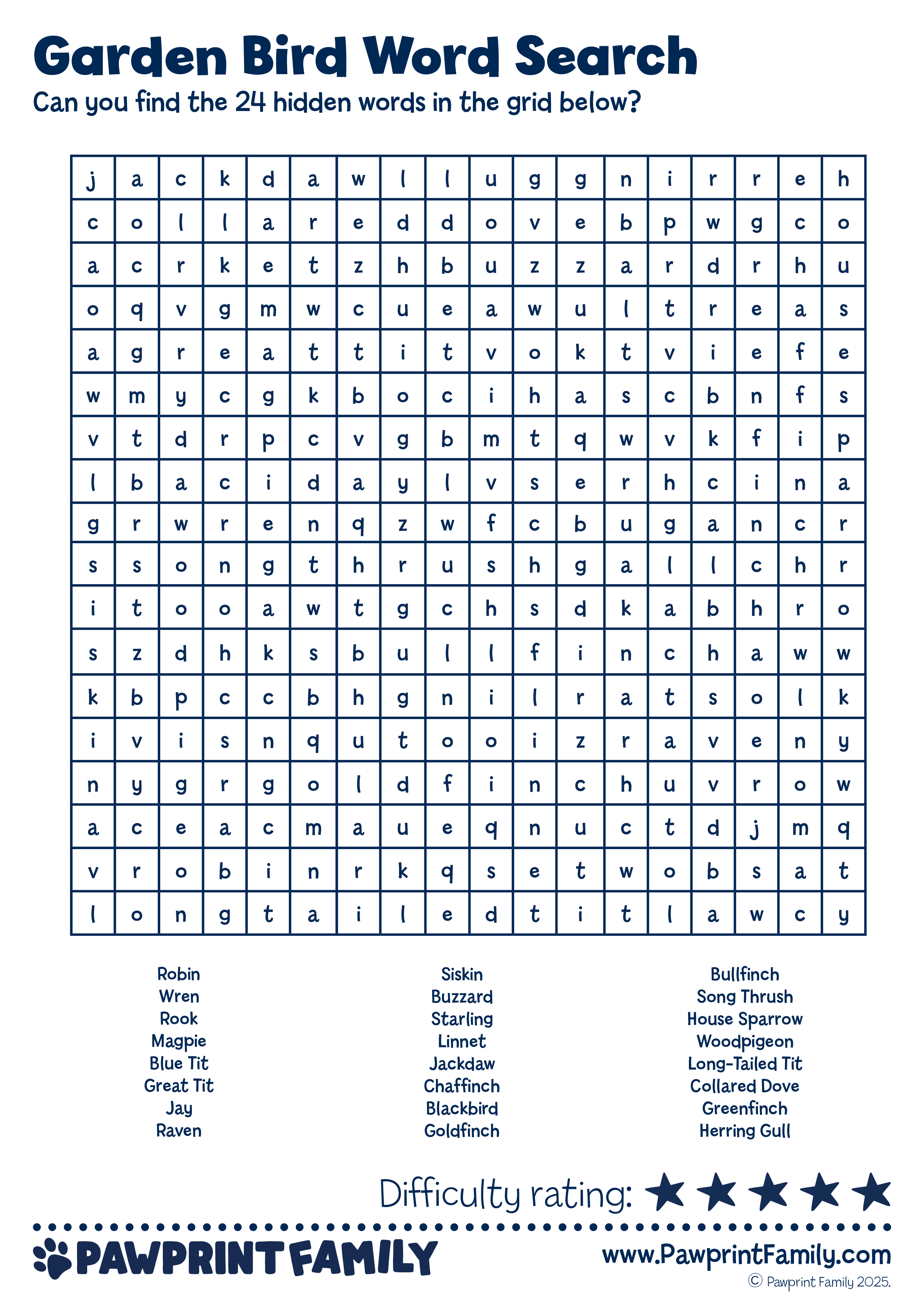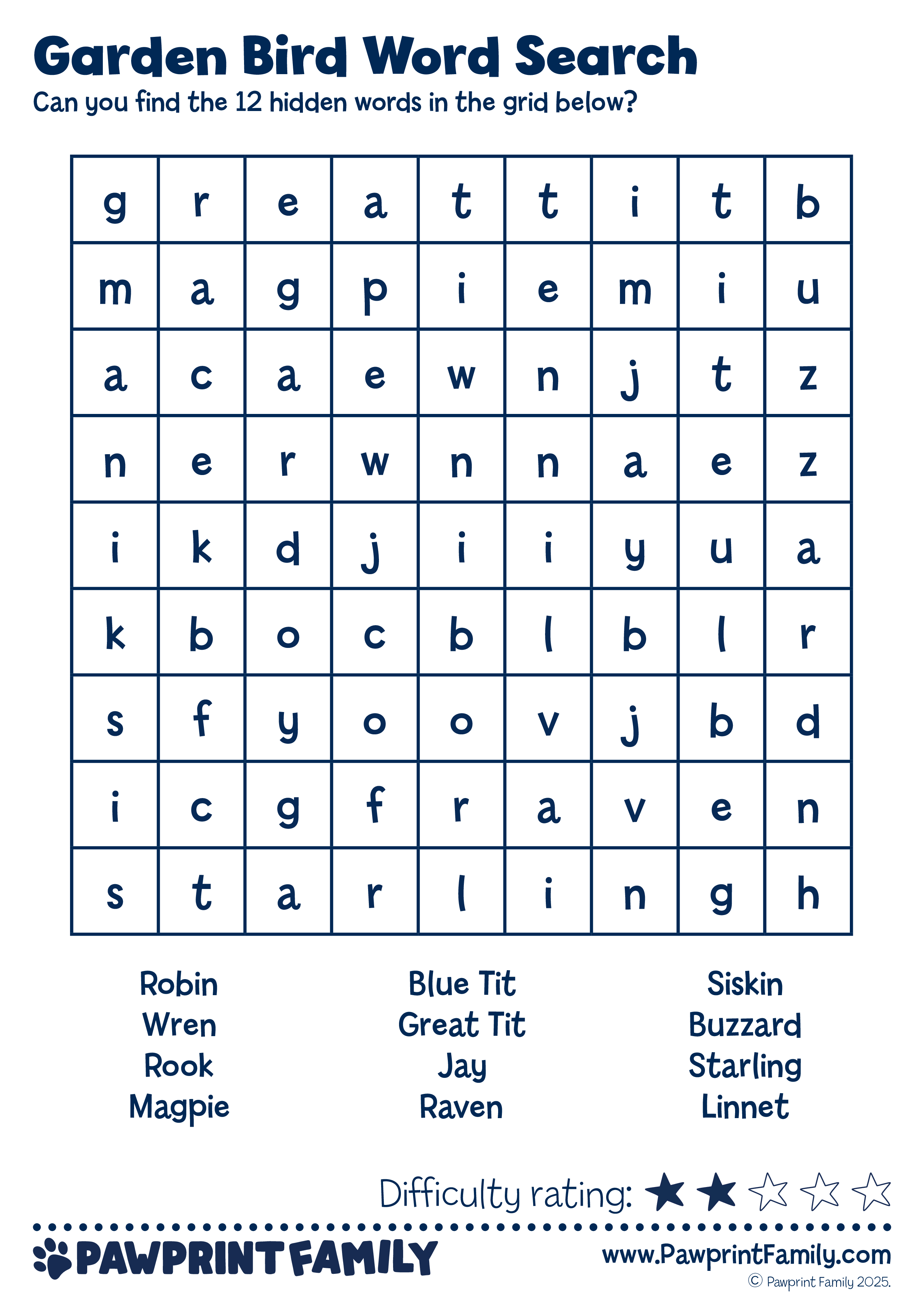 Download, print, and play! The Garden Bird Word Search is part of the Pawprint Family’s free resource collection – making learning irresistible with themed adventures that spark joy, skills, and lasting memories.