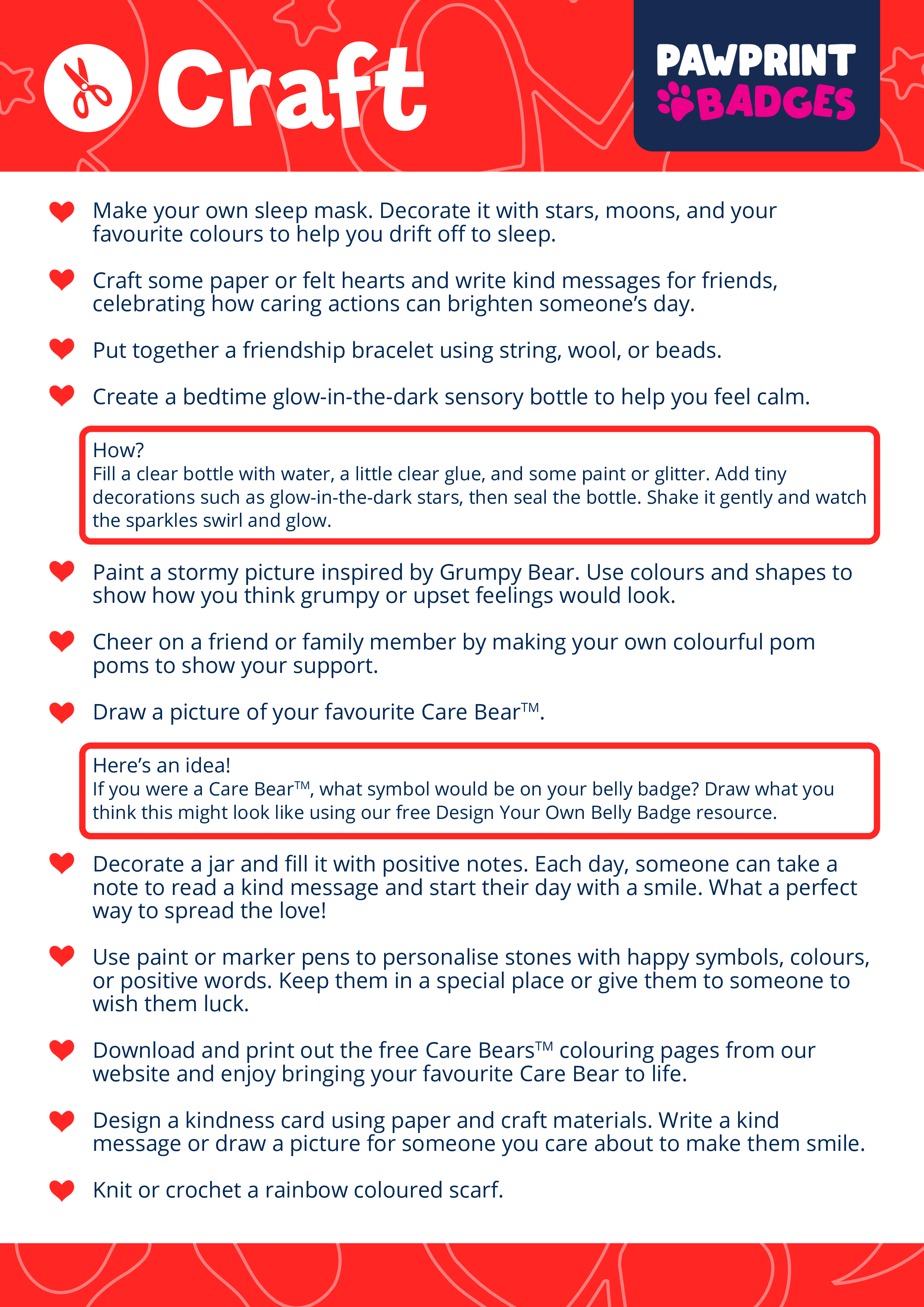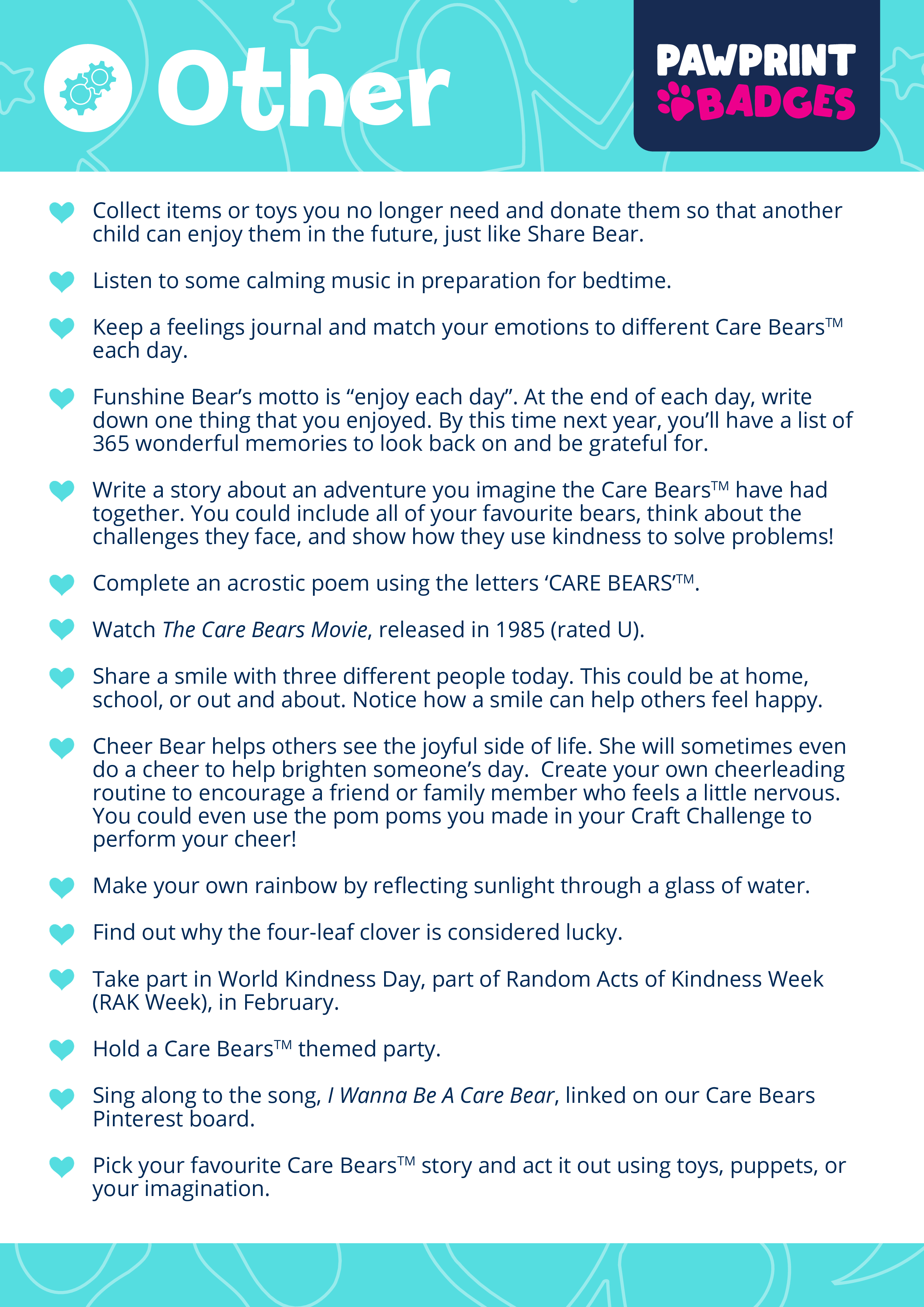 Download, print, and explore! The Care Bears Challenge Pack is part of the Pawprint Family’s free resource library – making caring adventures an irresistible journey, fostering empathy, creativity, and a joy of sharing.