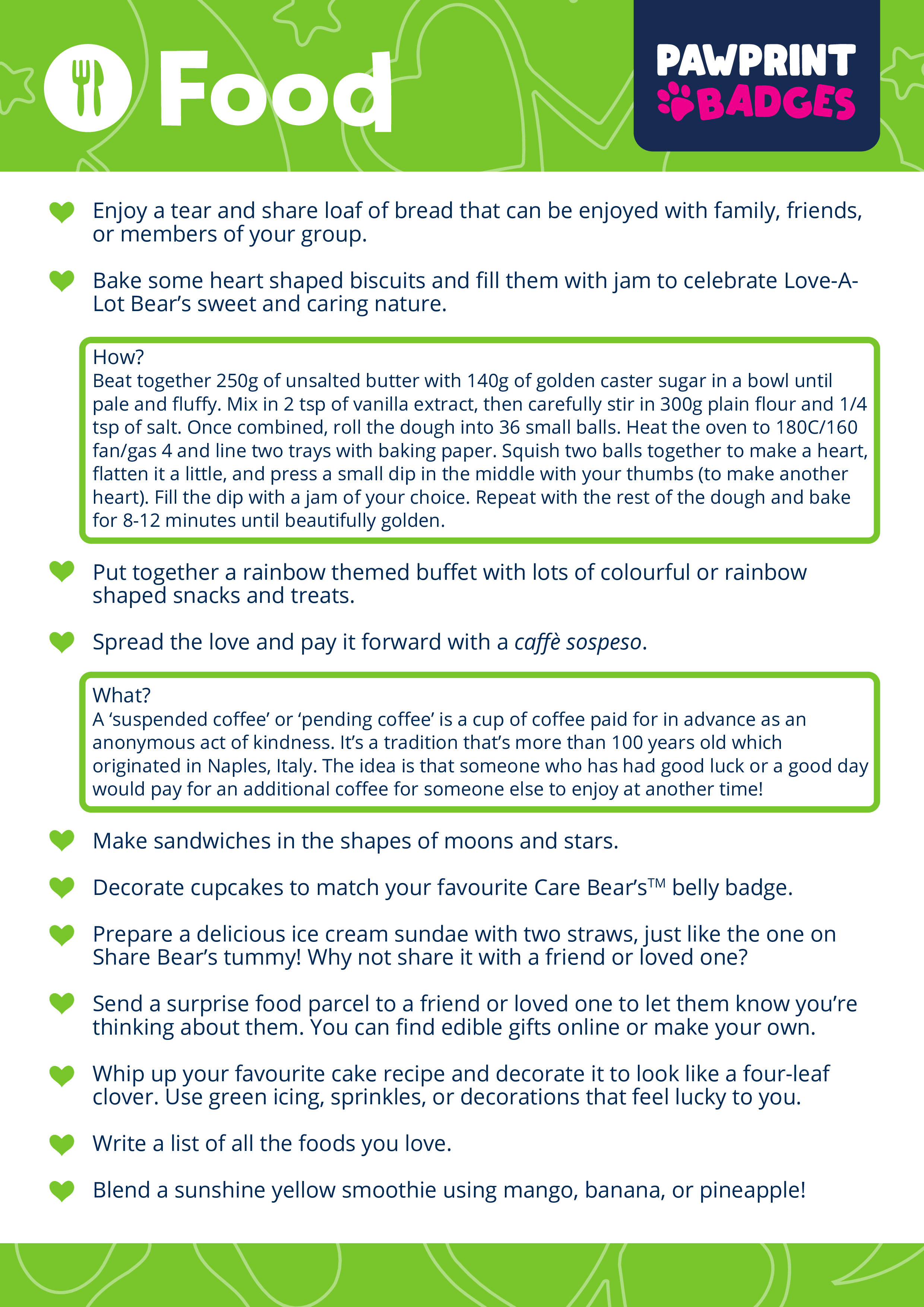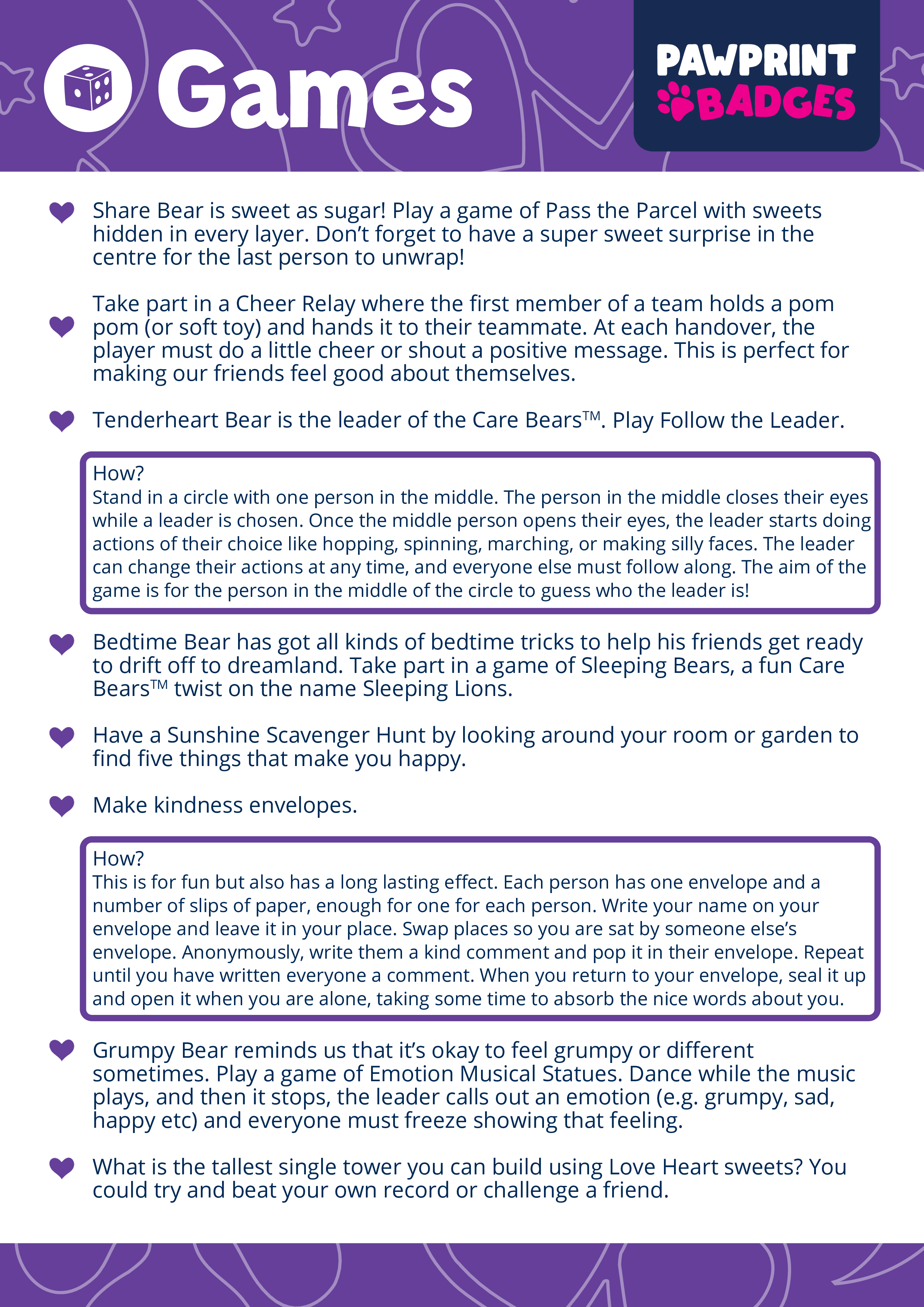 From crafting heartfelt messages and baking colourful treats to engaging in spirited games and thoughtful challenges, this pack invites young adventurers to spread joy alongside these beloved furry friends. With 40+ activities spanning Craft, Food, Games, and Other, it offers a joyful journey into the land of Care Bears, promoting compassion and community spirit.
