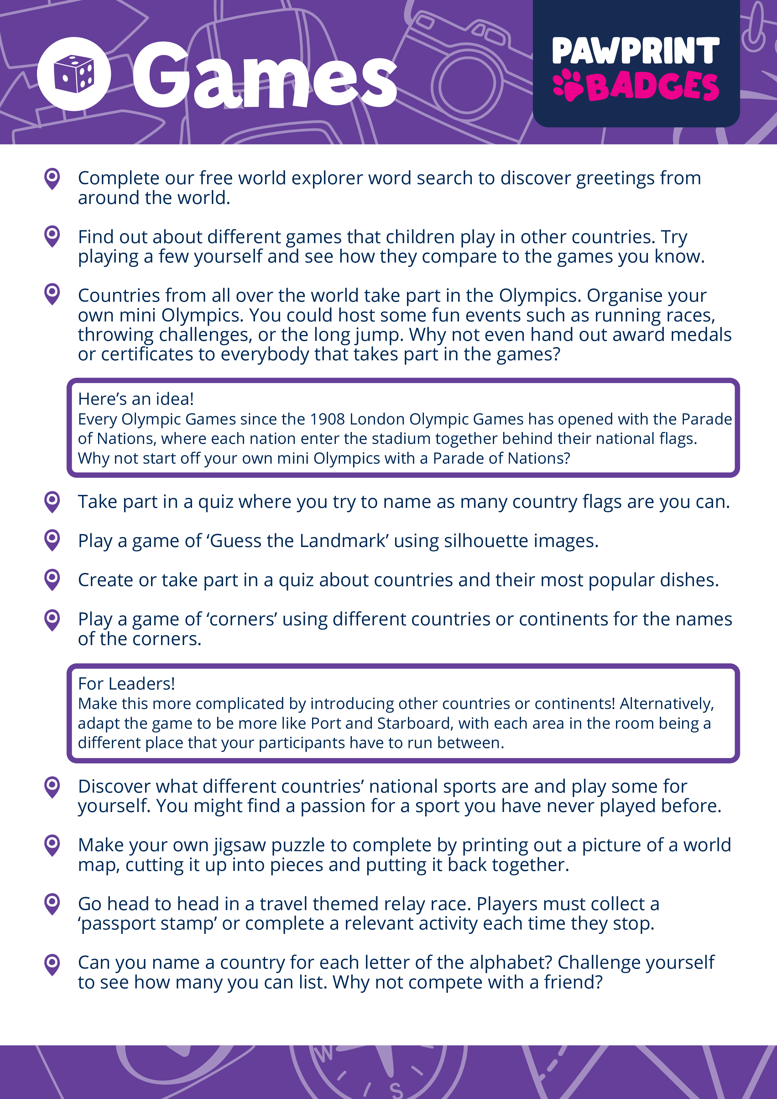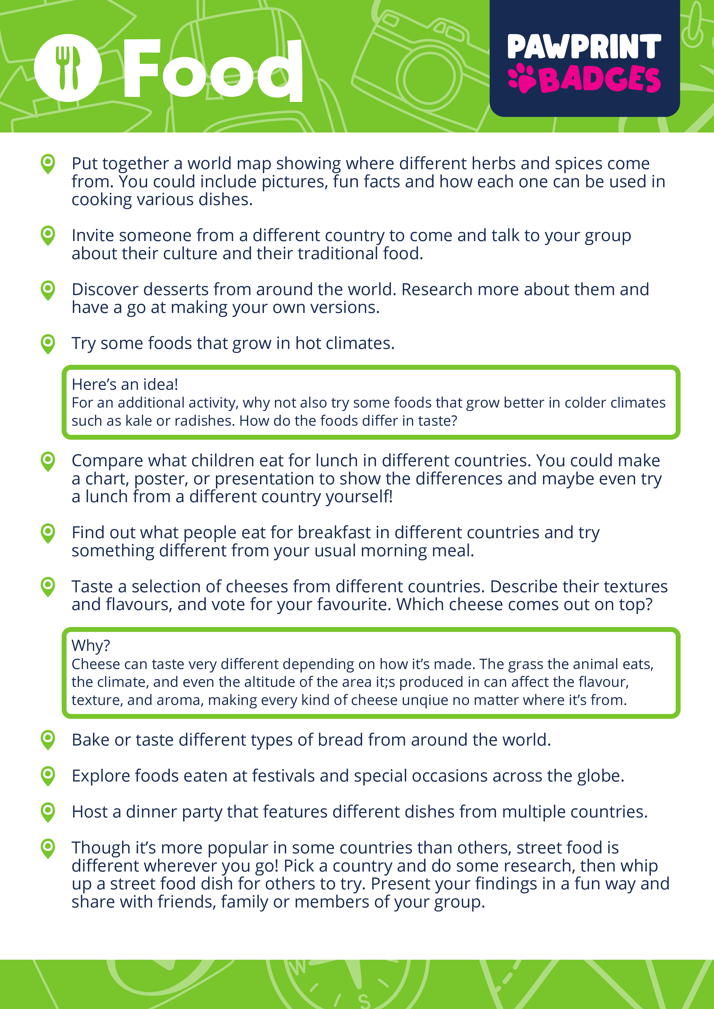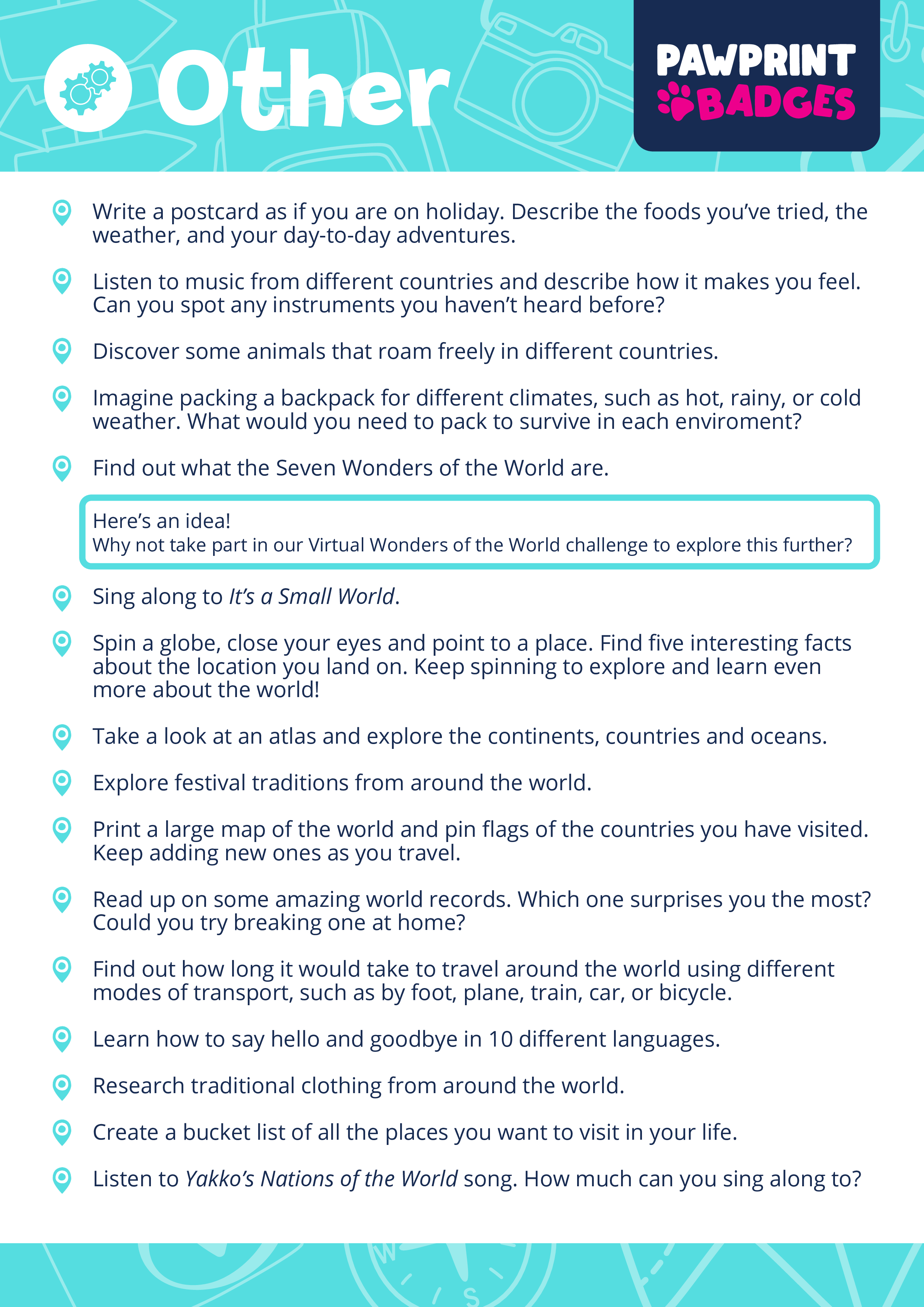 Download, print, and traverse the planet! The World Explorer Challenge Pack is part of the Pawprint Family’s free resource library – making global exploration exciting through themed adventures that cultivate curiosity, respect, and a passion for worldwide discovery.