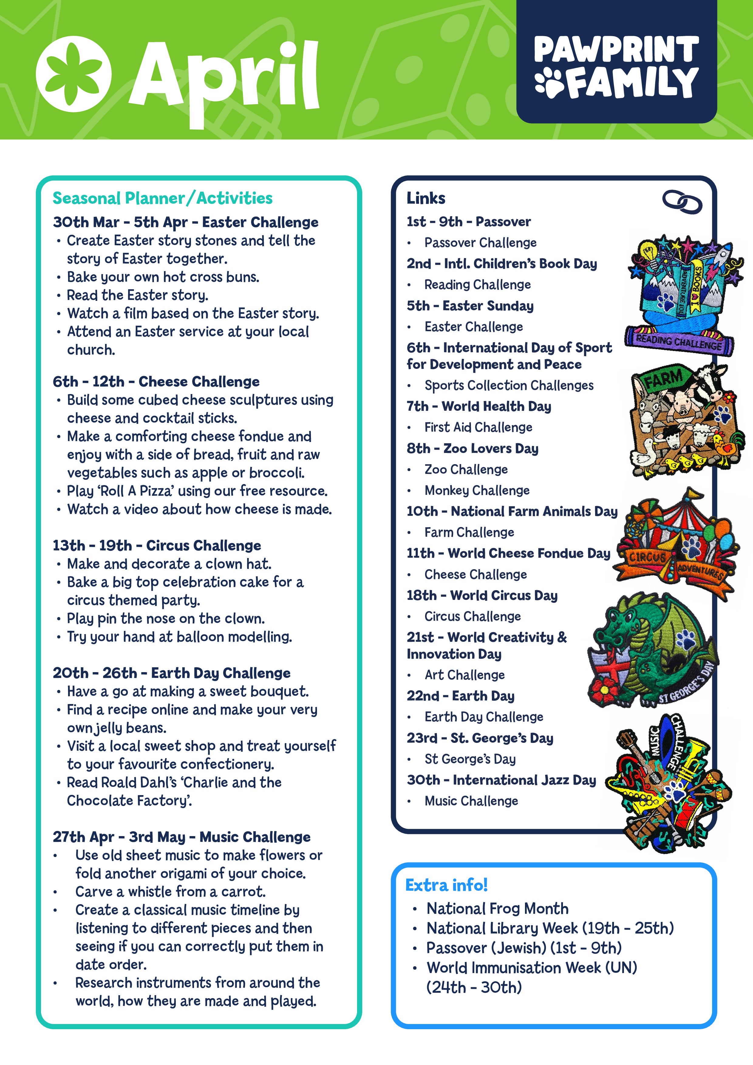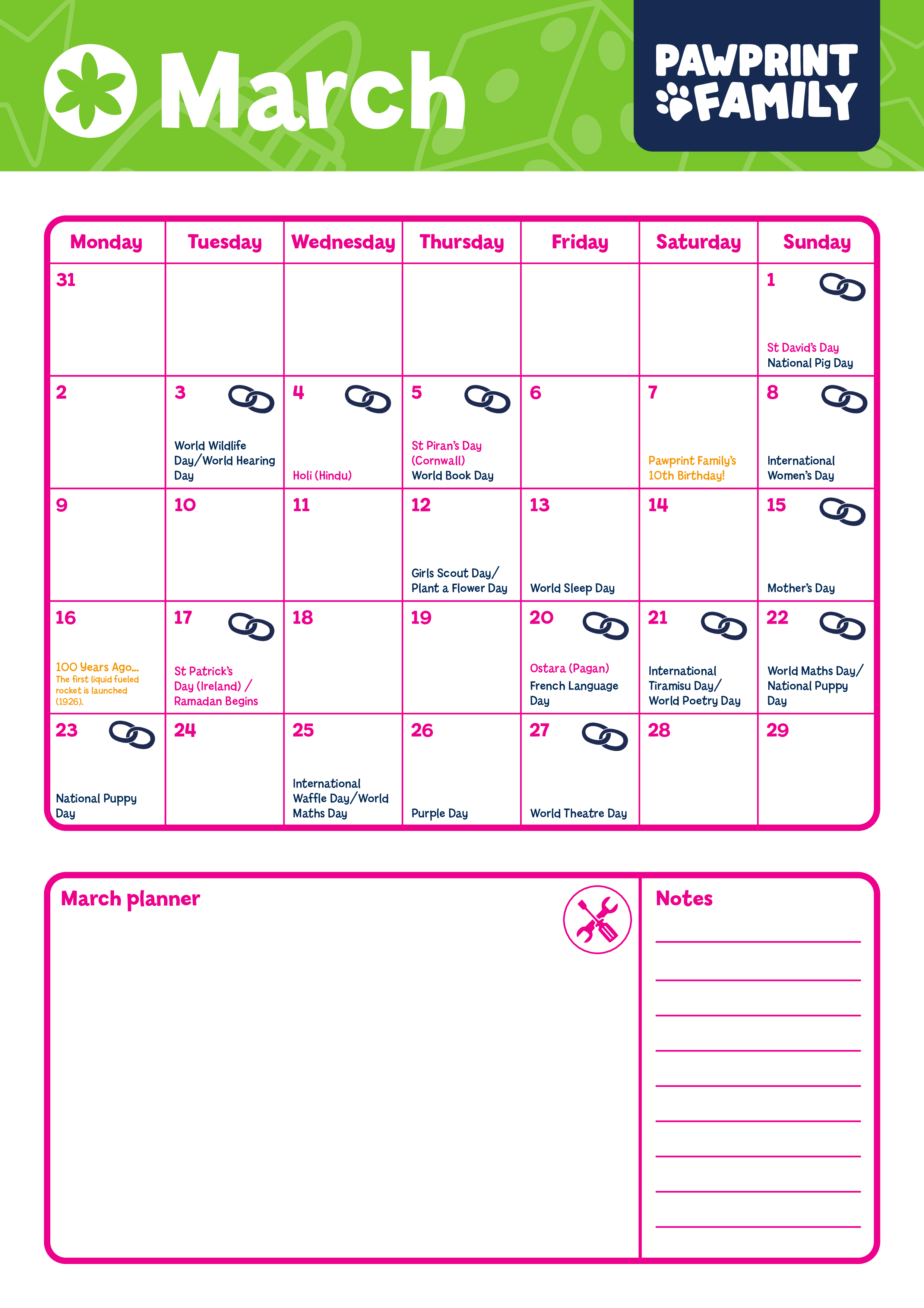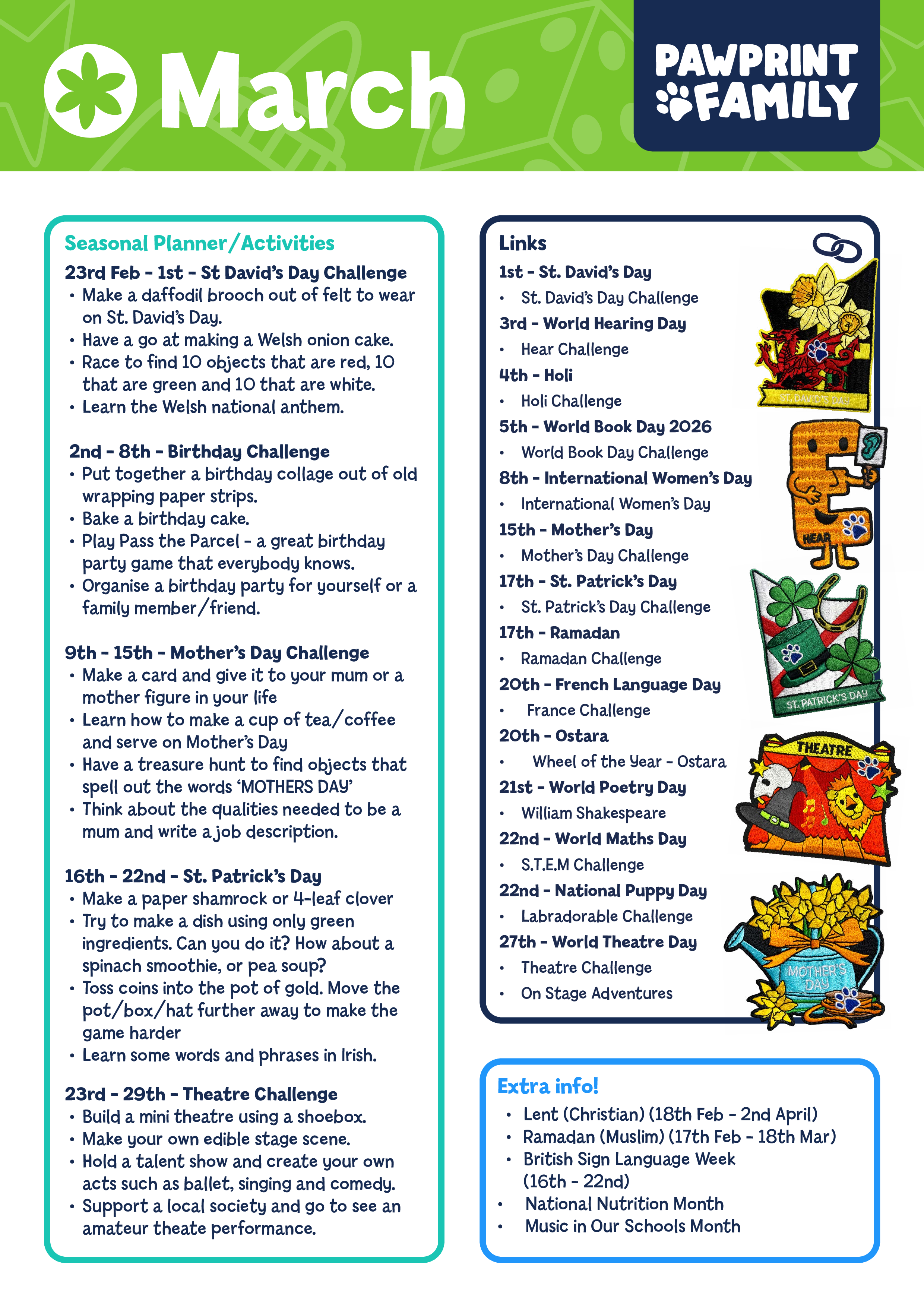 March: World Book Day, International Women’s Day, St Patrick’s Day, Pawprint Family’s 10th Birthday + related badge links such as World Book Day Challenge and Theatre Challenge (pages 8–9)