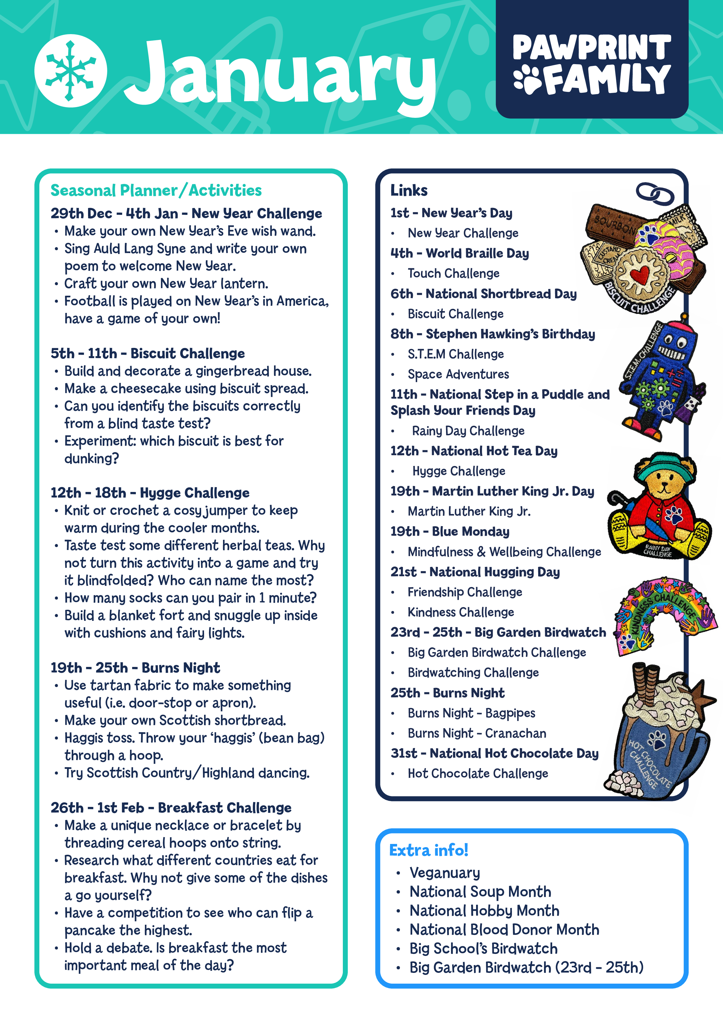 January: New Year’s Day, Martin Luther King Jr. Day, Burns Night, Hot Chocolate Day + badge links such as the New Year Challenge and Hygge Challenge (pages 4–5)