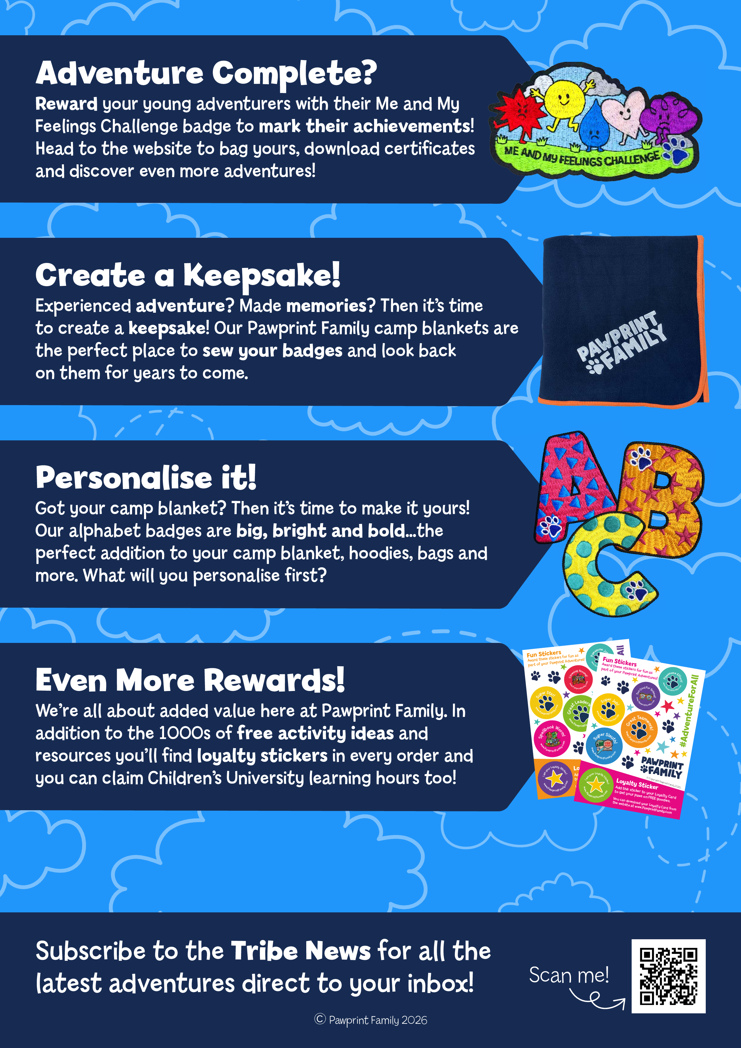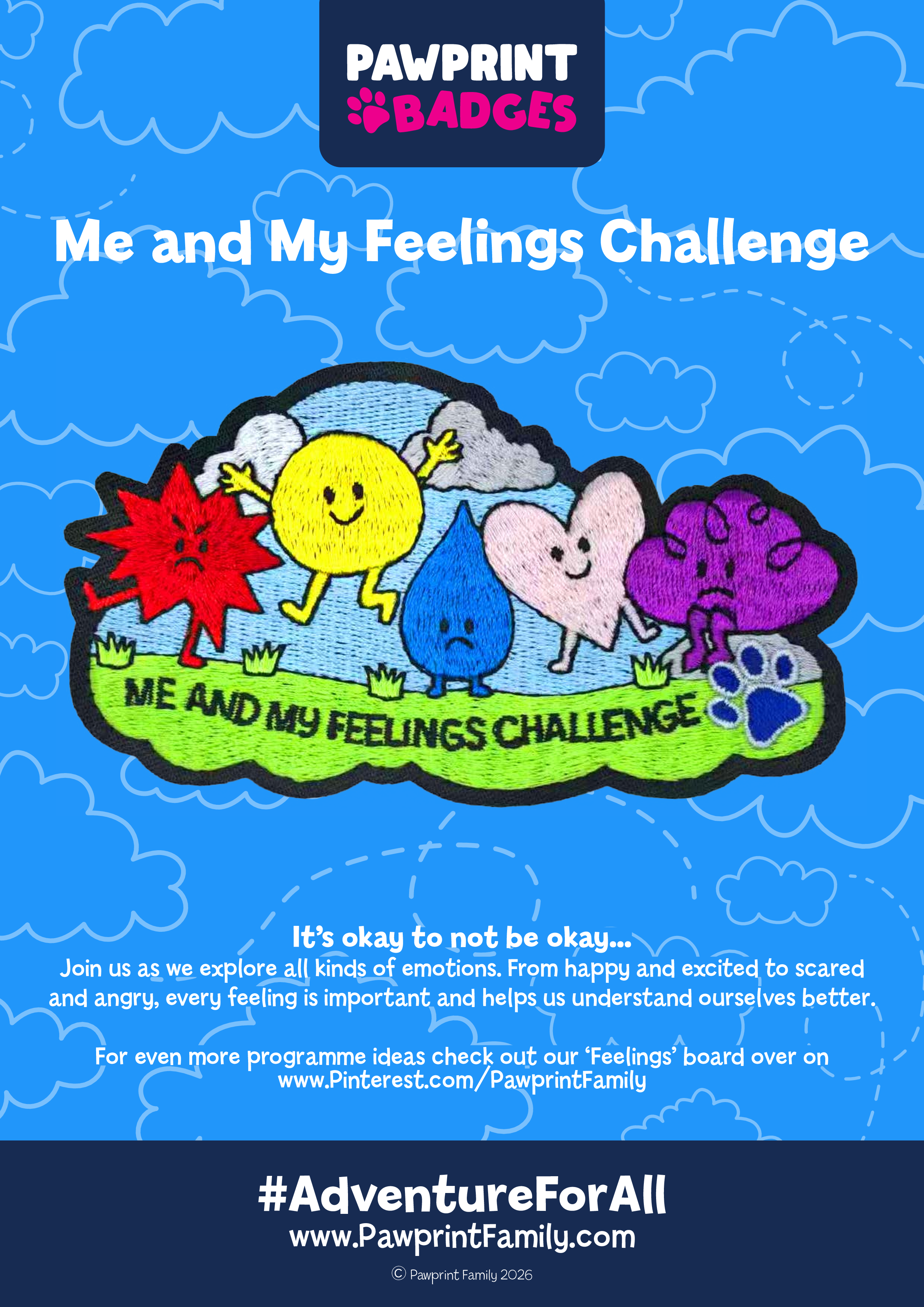 Download, print, and explore! The Me and My Feelings Challenge Pack is part of the Pawprint Family’s free resource library – creating safe, supportive adventures that help young people understand themselves, build resilience, and grow with confidence.