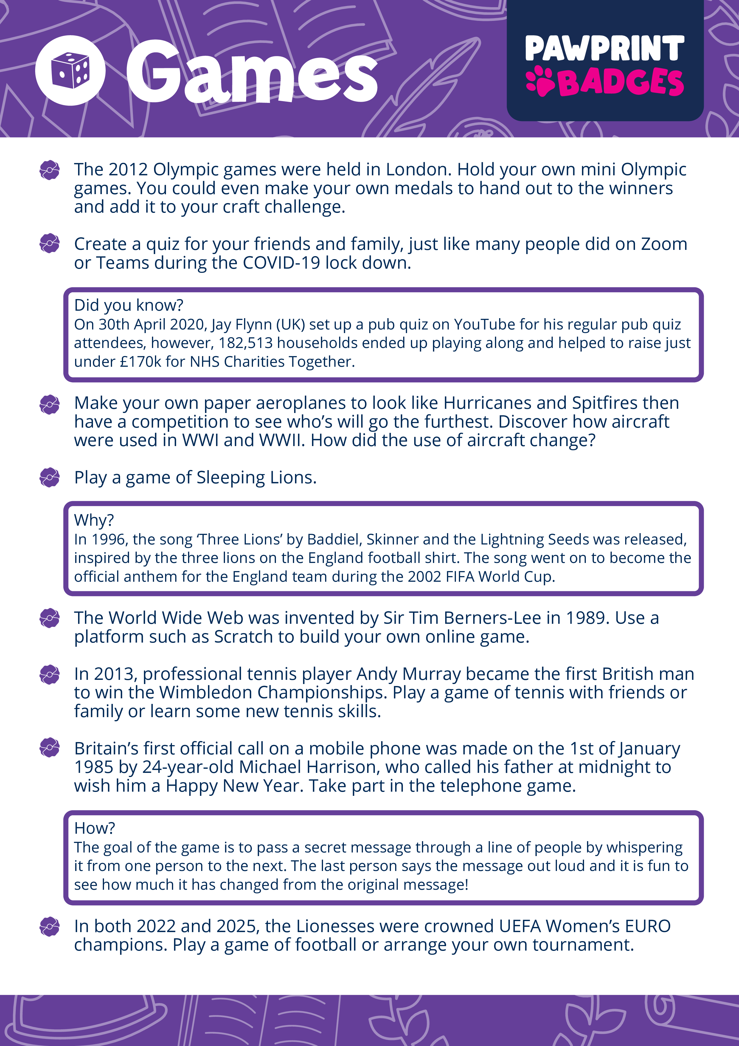 Activities 35 Weight 38.00g Category Free Resources Sub Category Free Resources Resource Type Challenge Packs Brand Pawprint Badges Collection History Timeline Code FR0831 - Perks