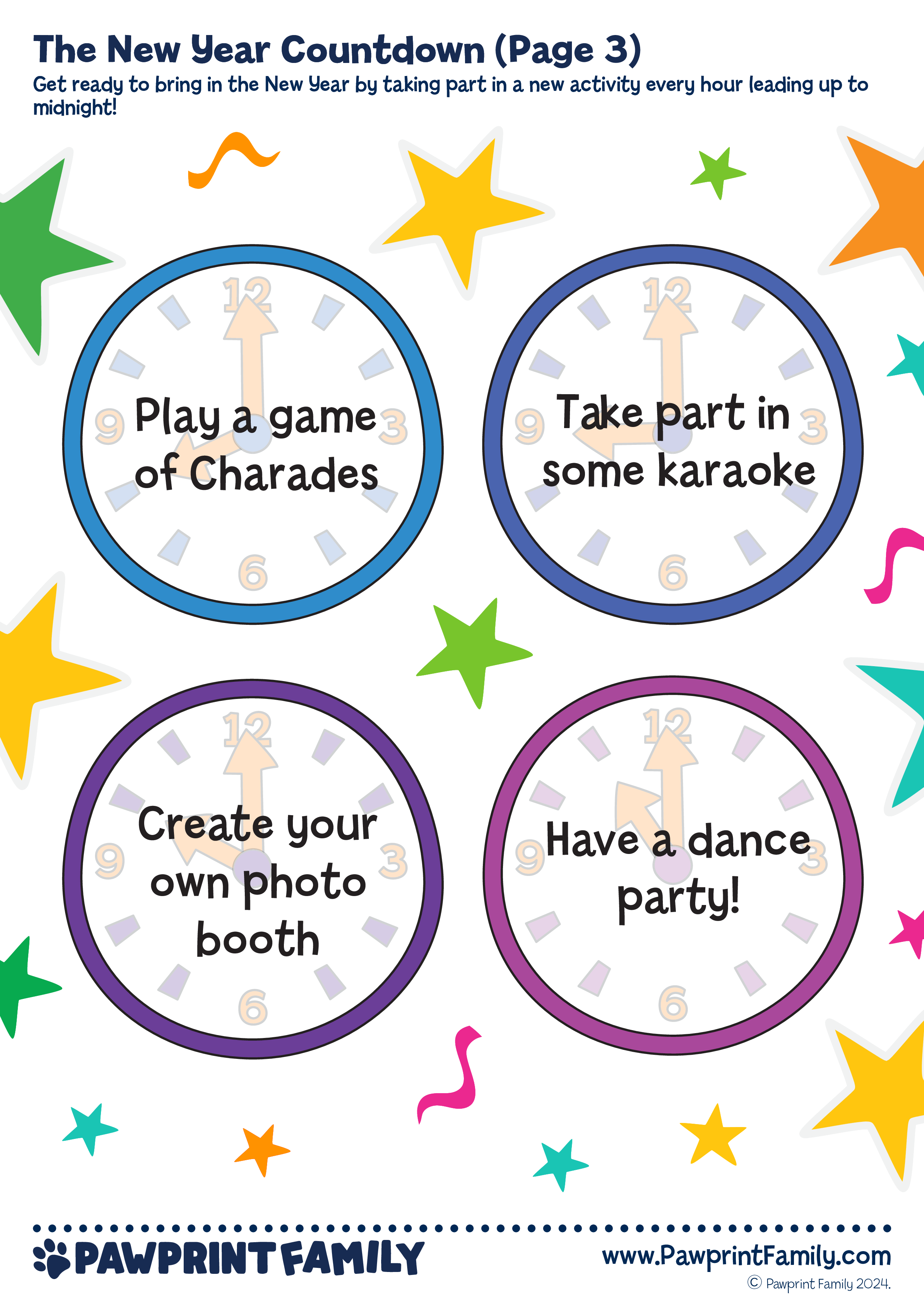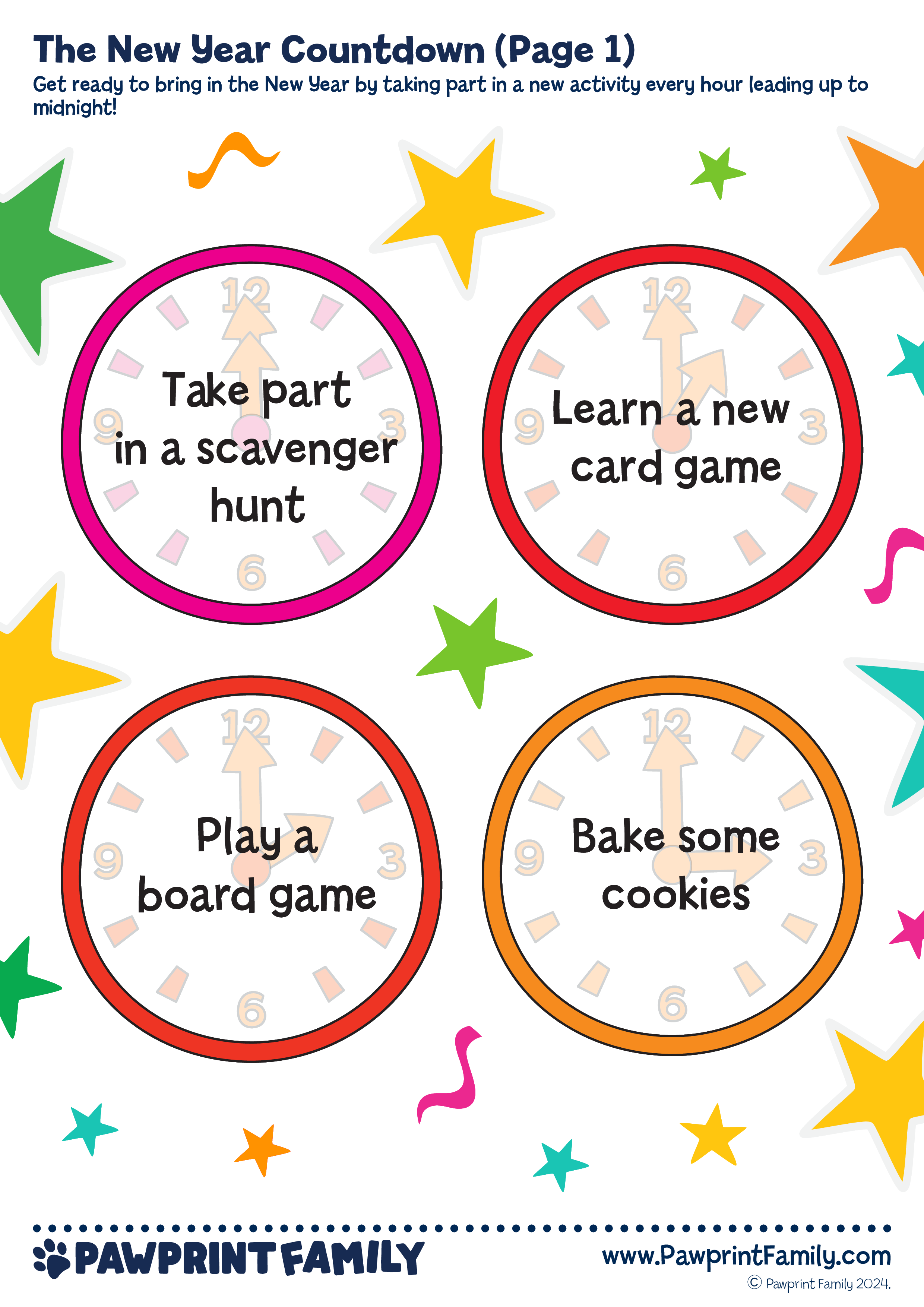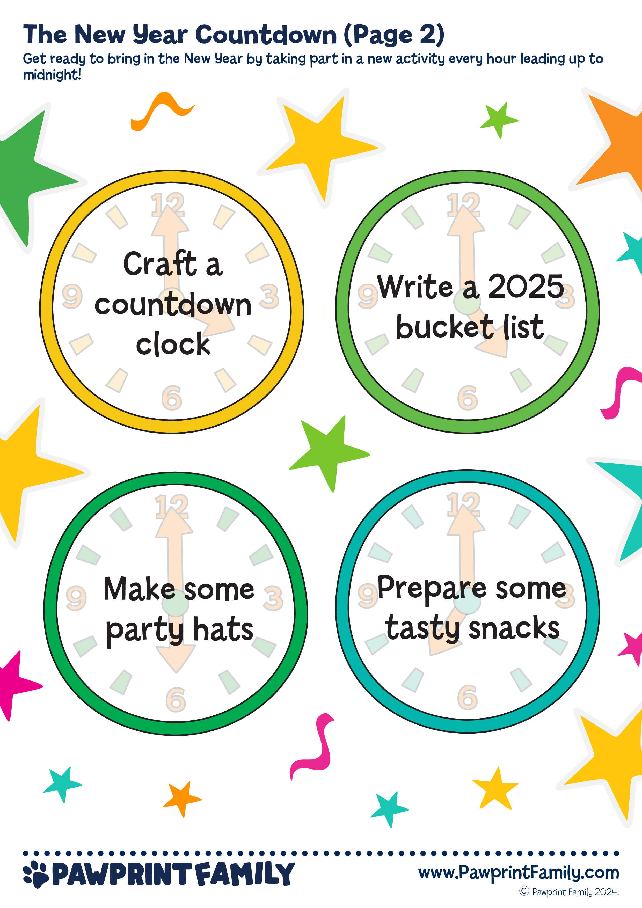 🎉 Get ready to welcome the New Year with excitement, creativity, and connection! The New Year Countdown is a free printable activity resource designed to guide children and families through a fun-filled countdown, with a new activity to enjoy every hour leading up to midnight.Featuring bright, clock-themed activity prompts, this resource turns New Year’s Eve into a memorable experience packed with games, creativity, and shared moments. Simply print, display, and enjoy — no complicated prep required.