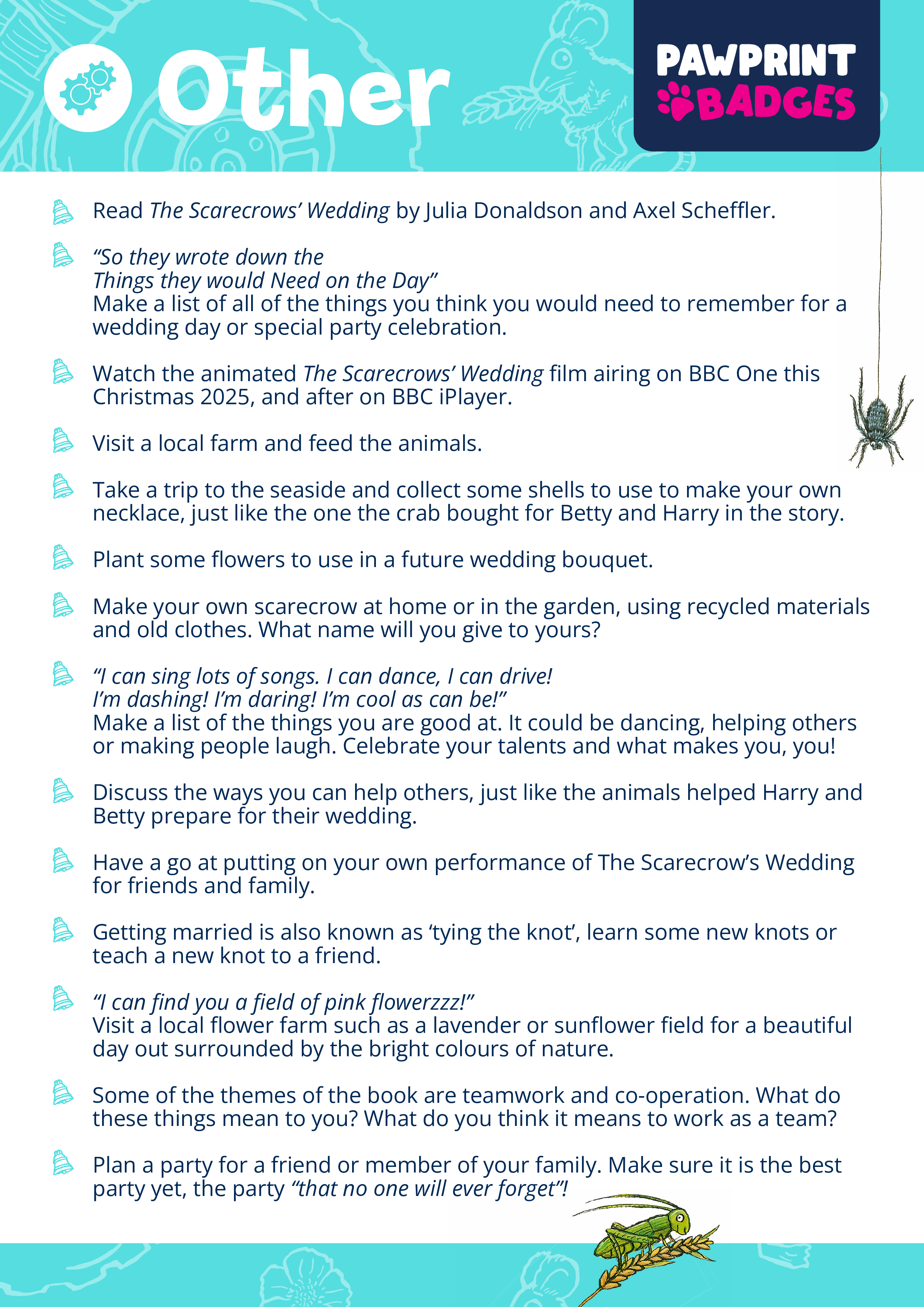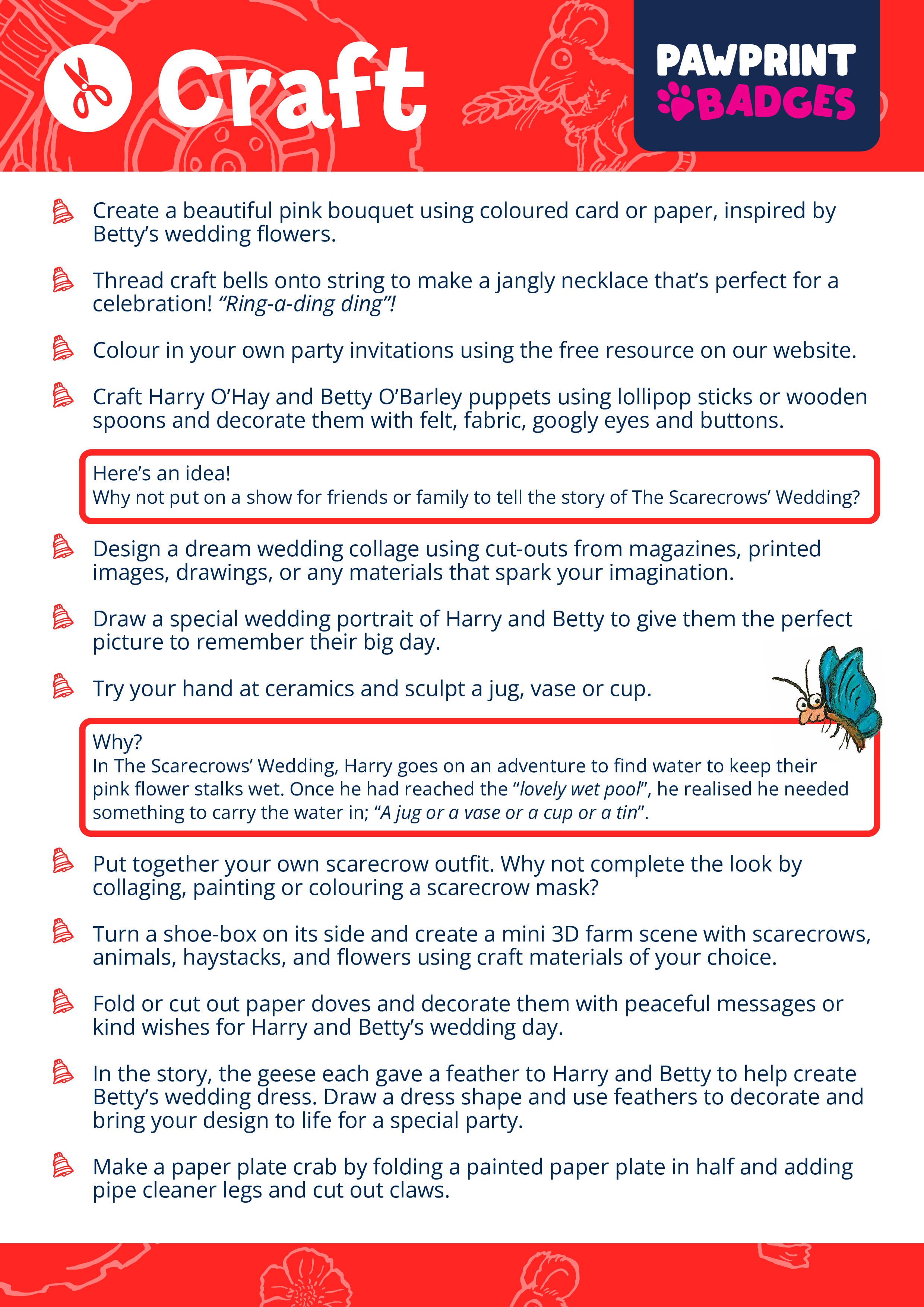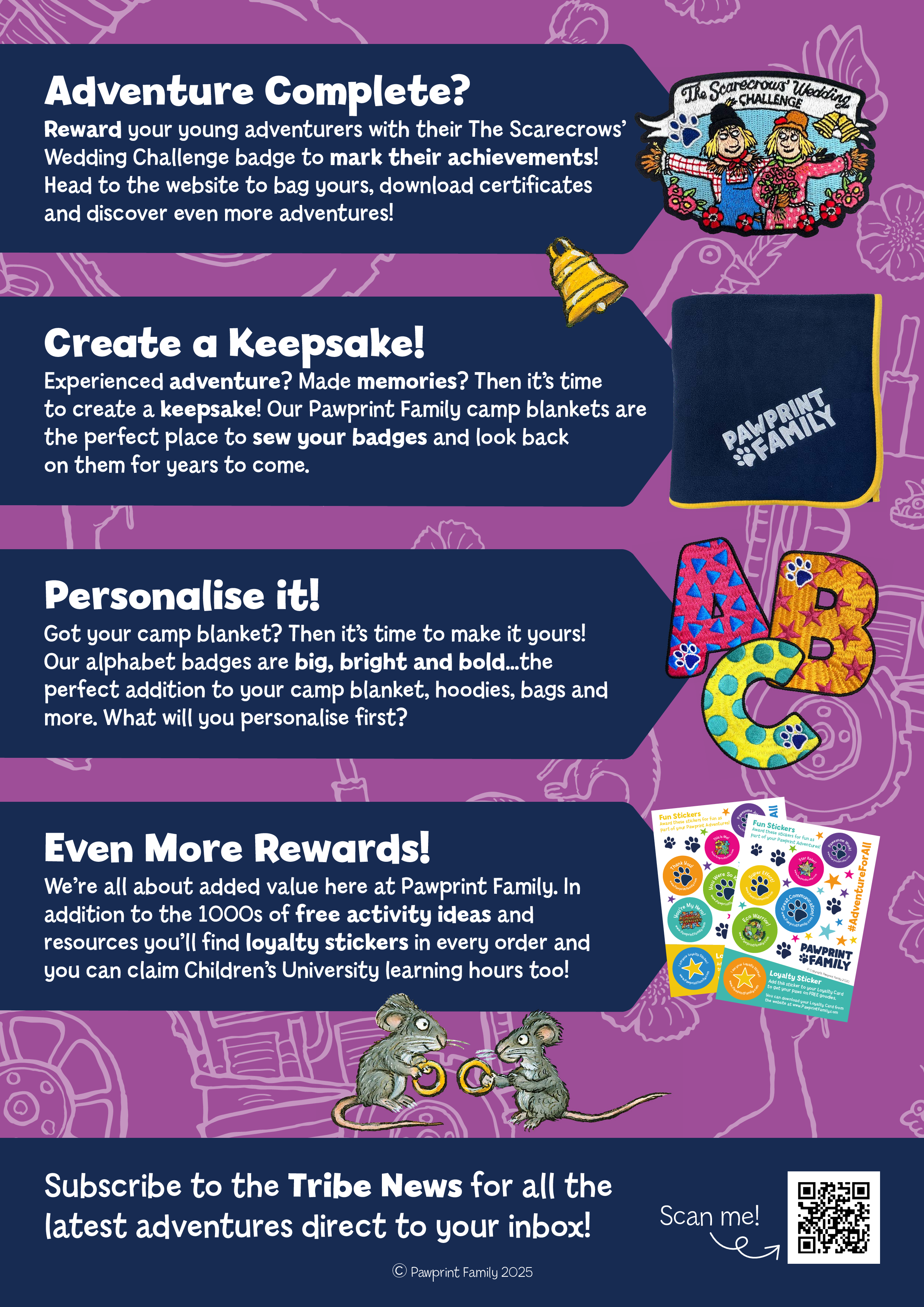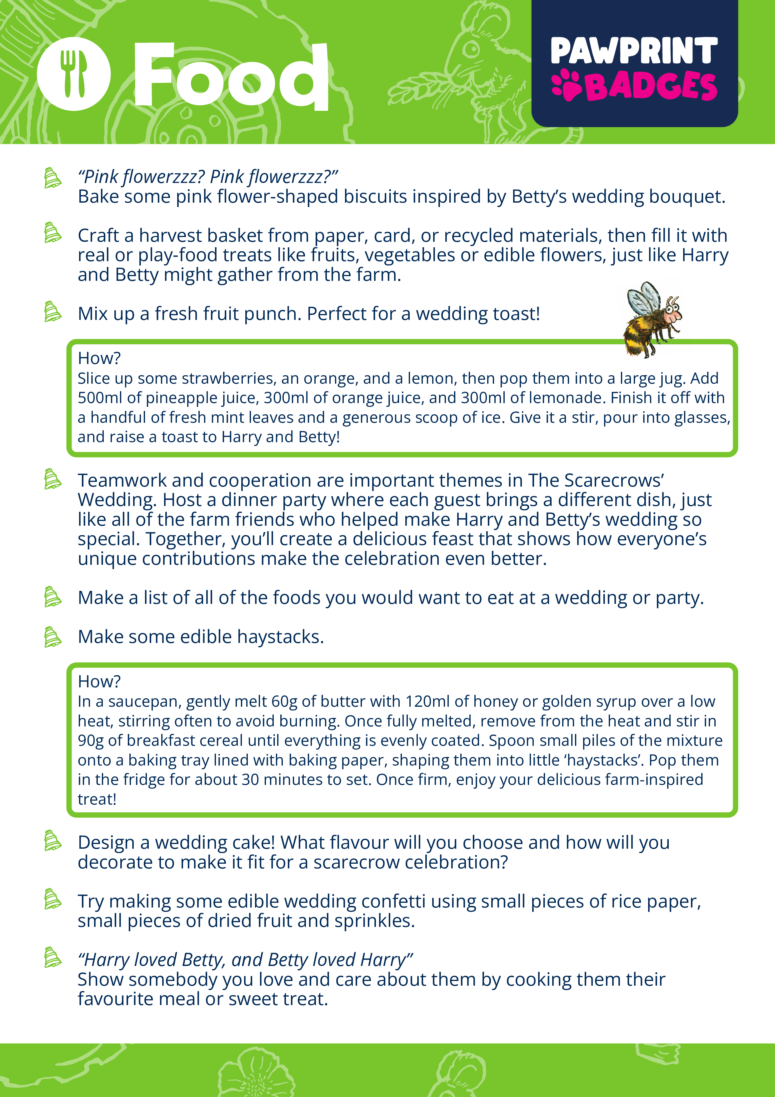 Celebrate teamwork, love, and farmyard fun with the Scarecrows’ Wedding Challenge Pack – a free downloadable resource packed with hands-on activities to bring Harry O’Hay and Betty O’Barley’s big day to life in your group, classroom, or home.