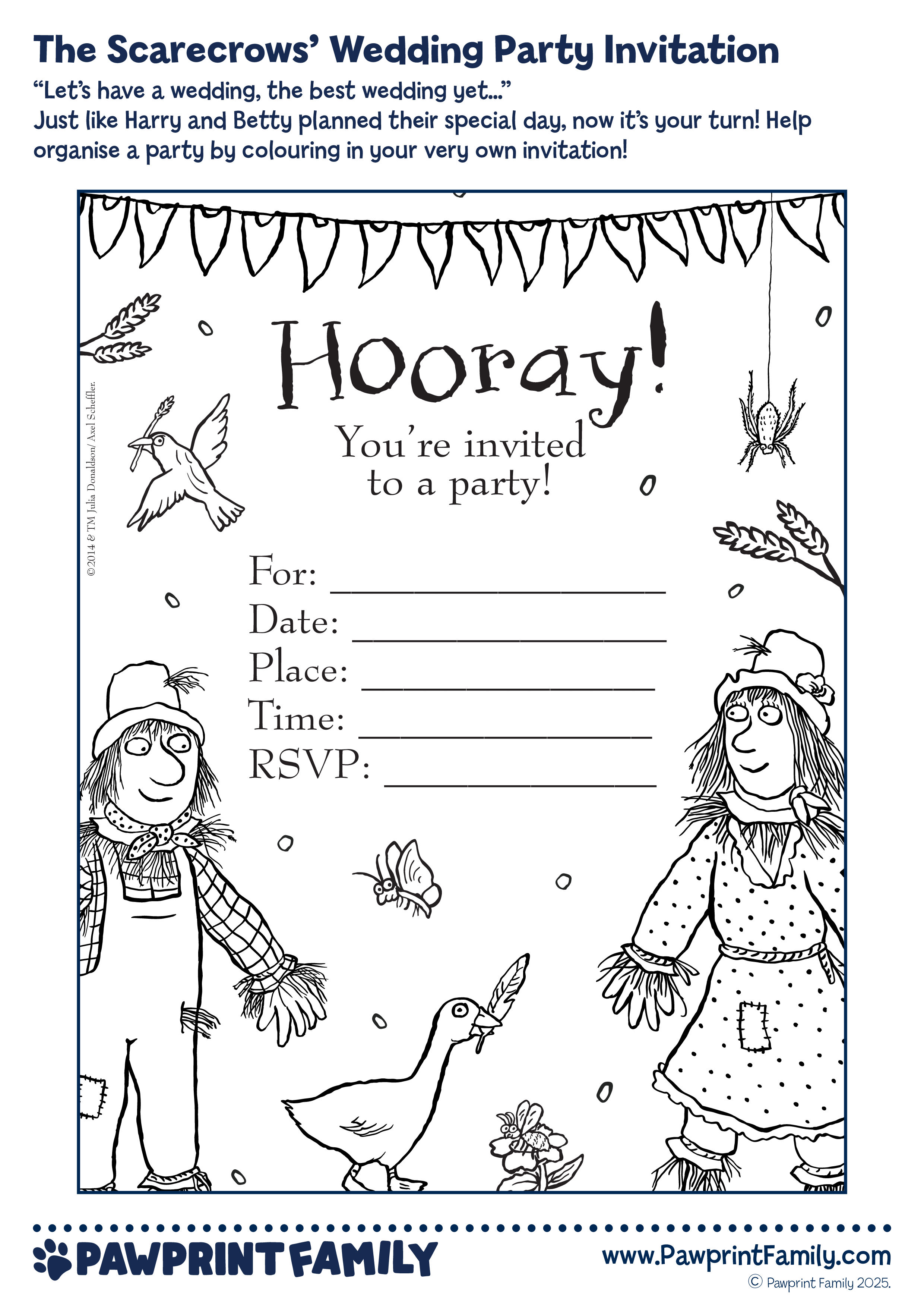 Celebrate in style with The Scarecrows’ Wedding Party Invite – a free printable resource inspired by Julia Donaldson and Axel Scheffler’s much-loved story. Just like Harry O’Hay and Betty O’Barley planned their special day, now it’s your turn to get ready for a wedding-themed celebration!