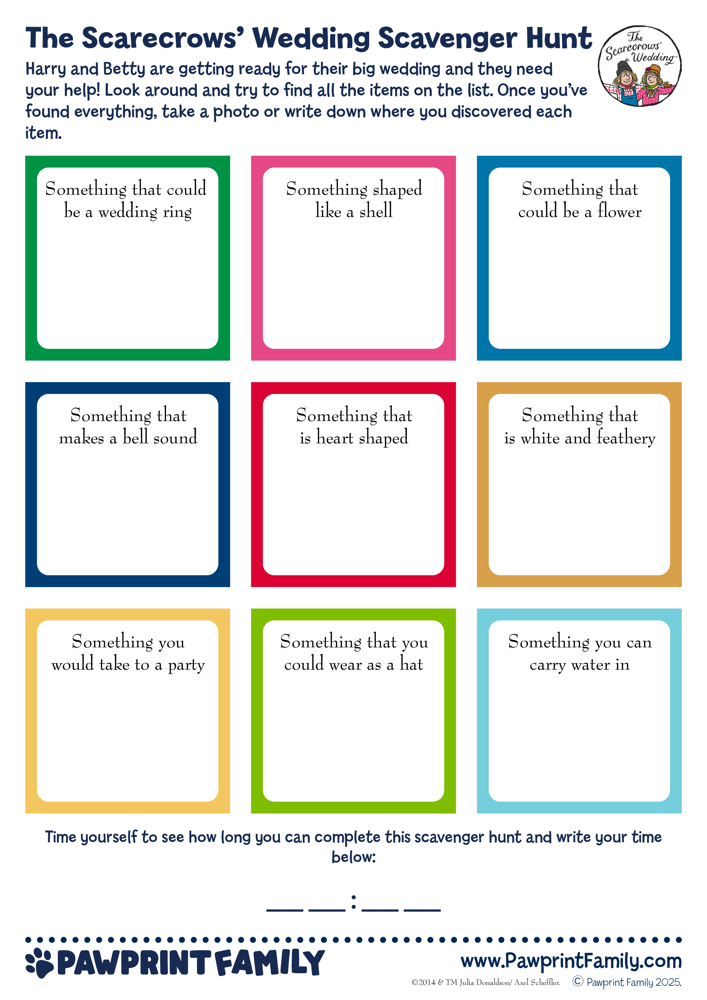 Celebrate teamwork and story magic with The Scarecrows’ Wedding Scavenger Hunt – a free printable activity inspired by Julia Donaldson and Axel Scheffler’s much-loved tale. Help Harry O’Hay and Betty O’Barley get ready for their big day by finding all the special items on their wedding list.