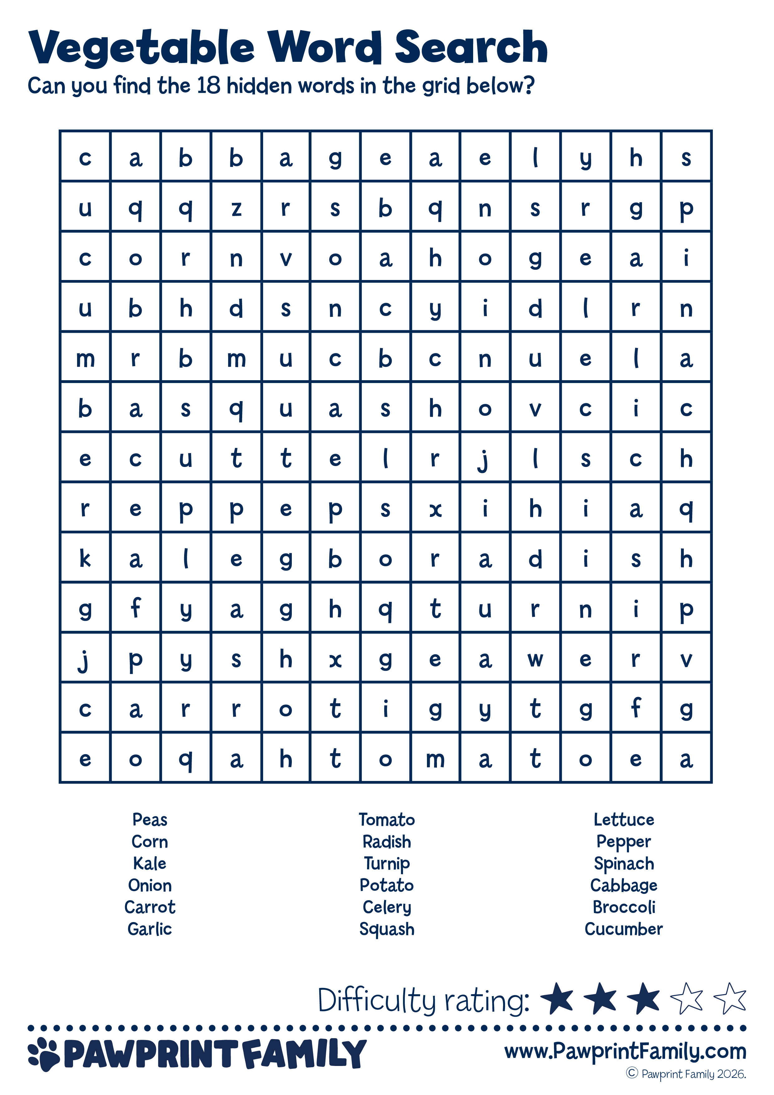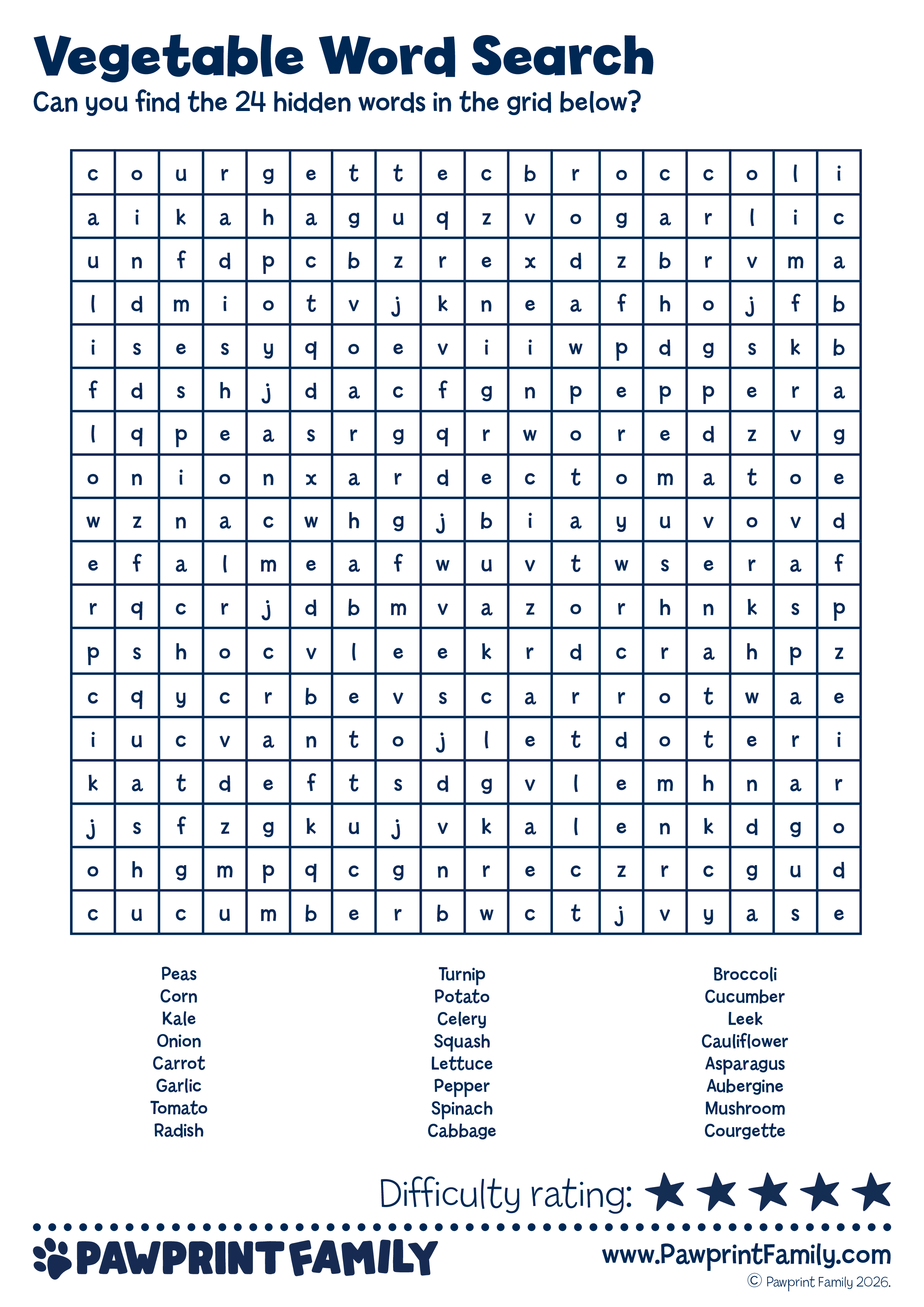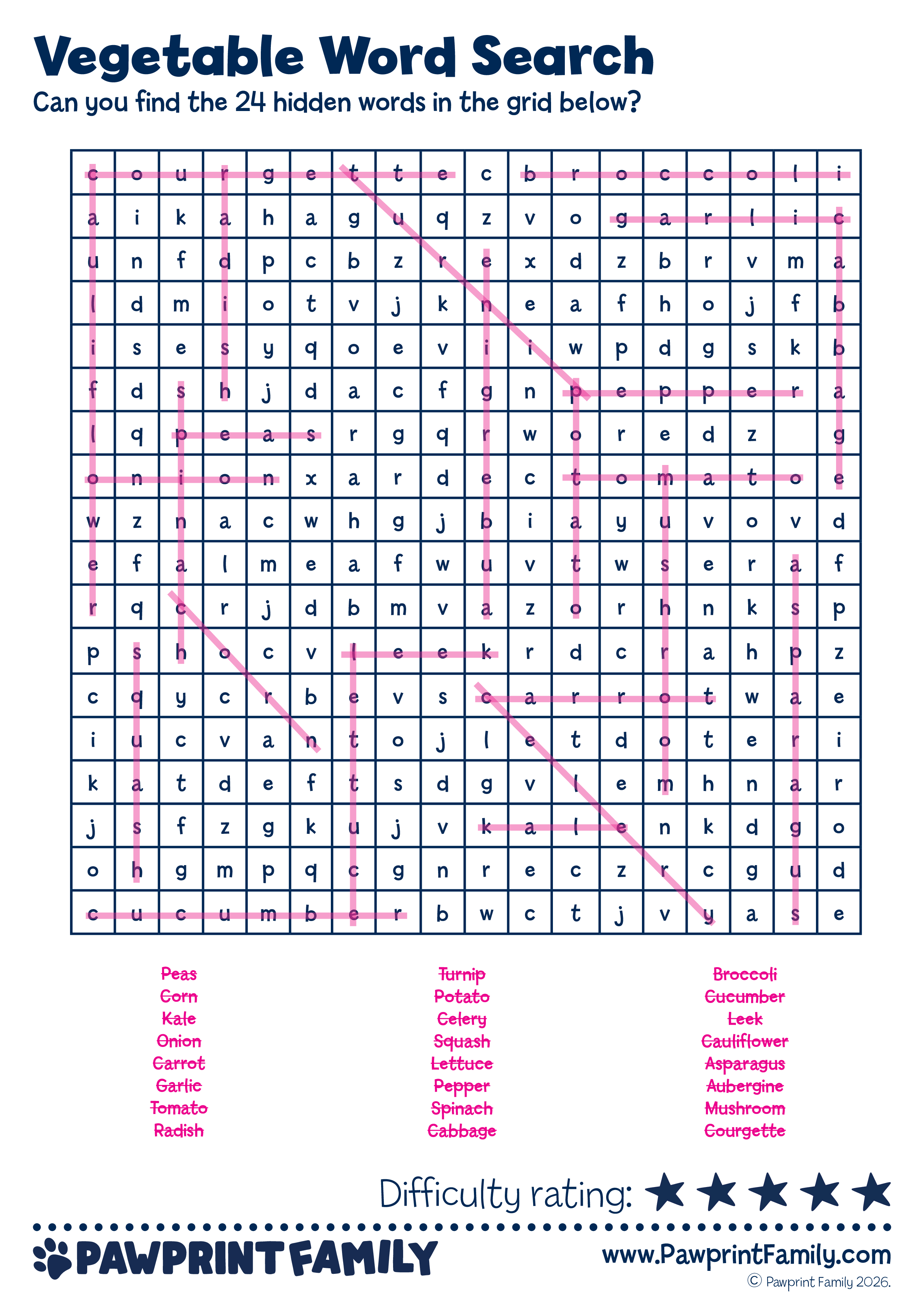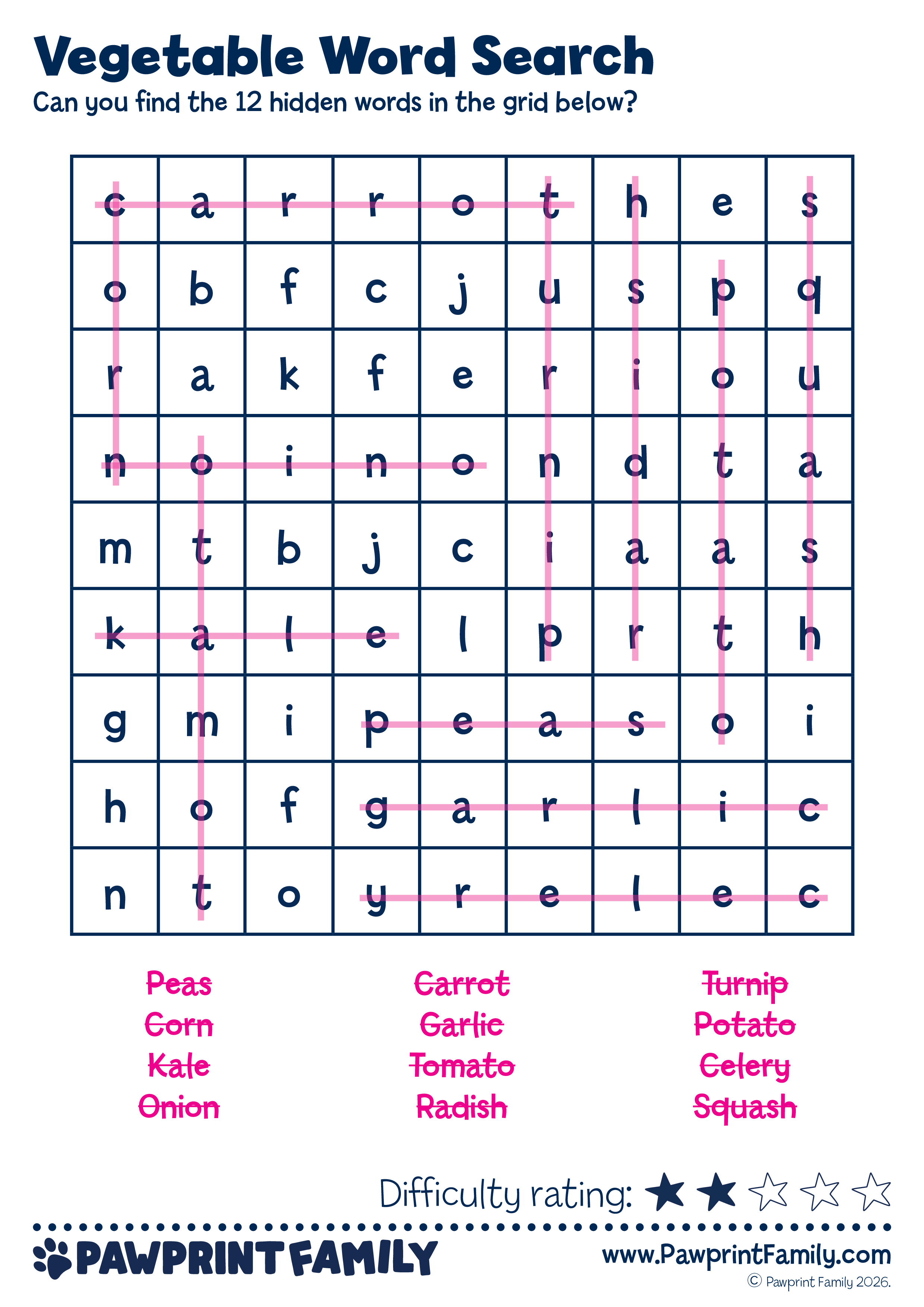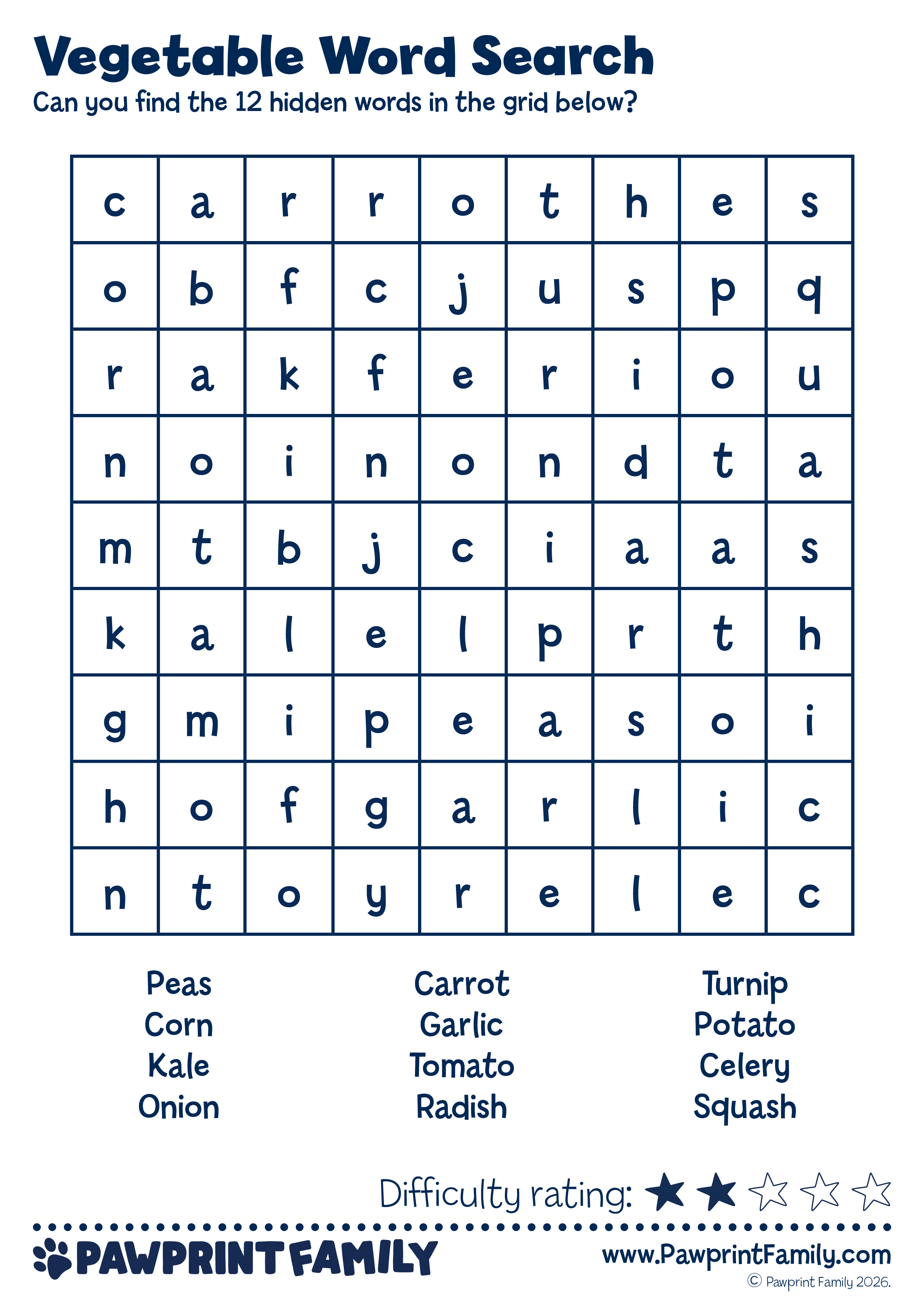 Download, print, and start searching! The Vegetable Word Search is part of the Pawprint Family’s free resource collection – making learning about food fun, focused, and full of everyday adventure. 🥕