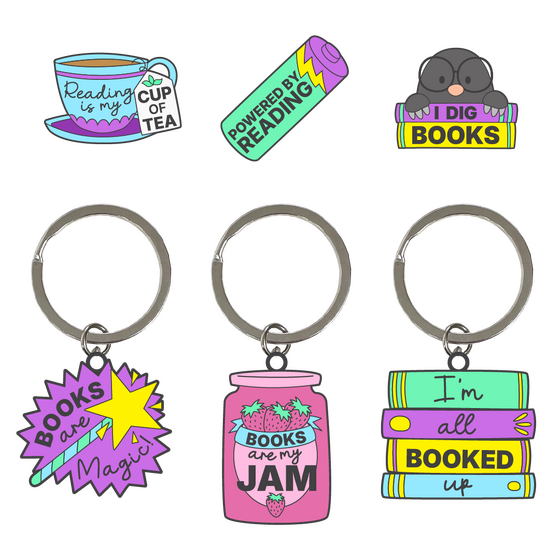 World Book Day branded counter display box containing 50 enamel pins and 36 keyrings. Features 6 brand new and exclusive designs.