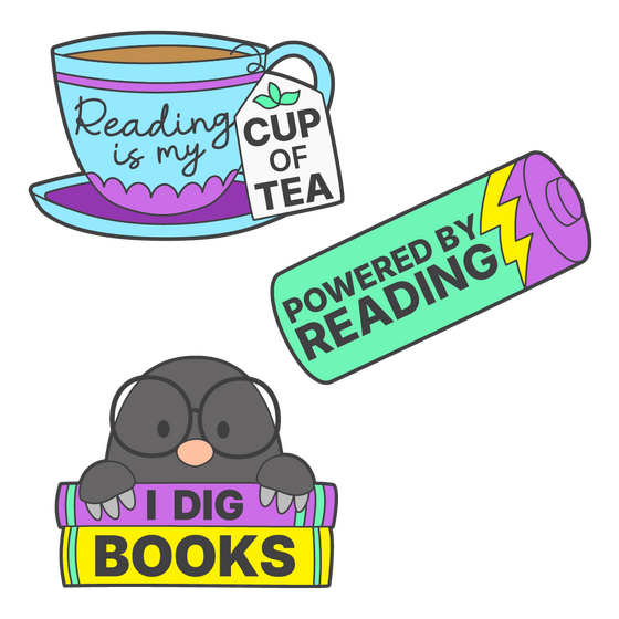 World Book Day branded counter display box containing 50 enamel pins. Features 3 brand new and exclusive designs.
